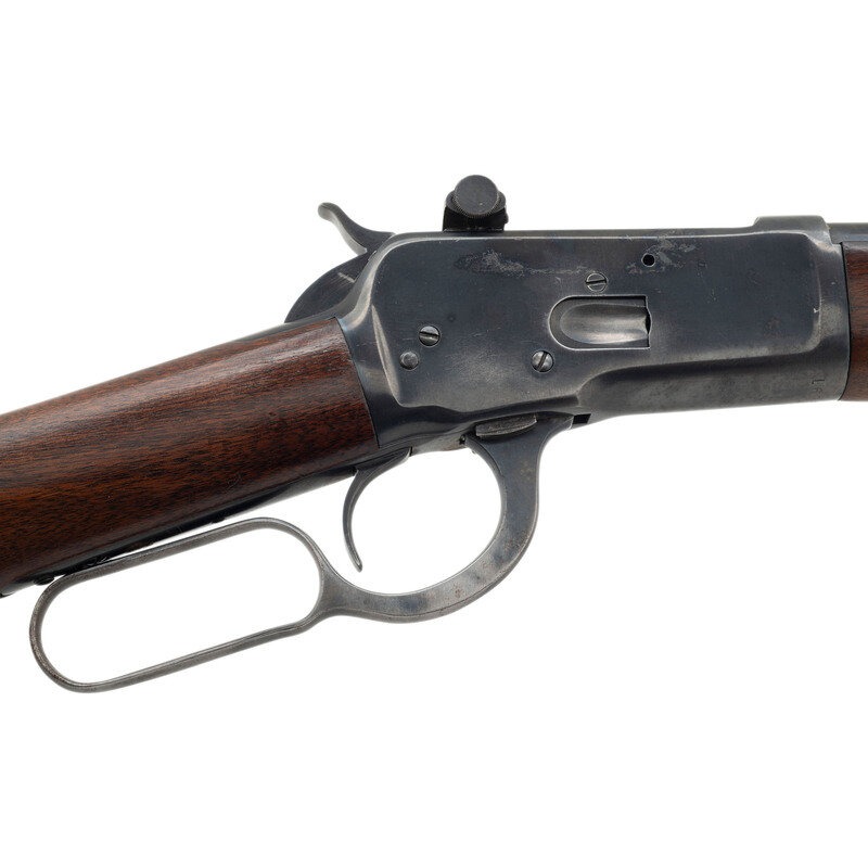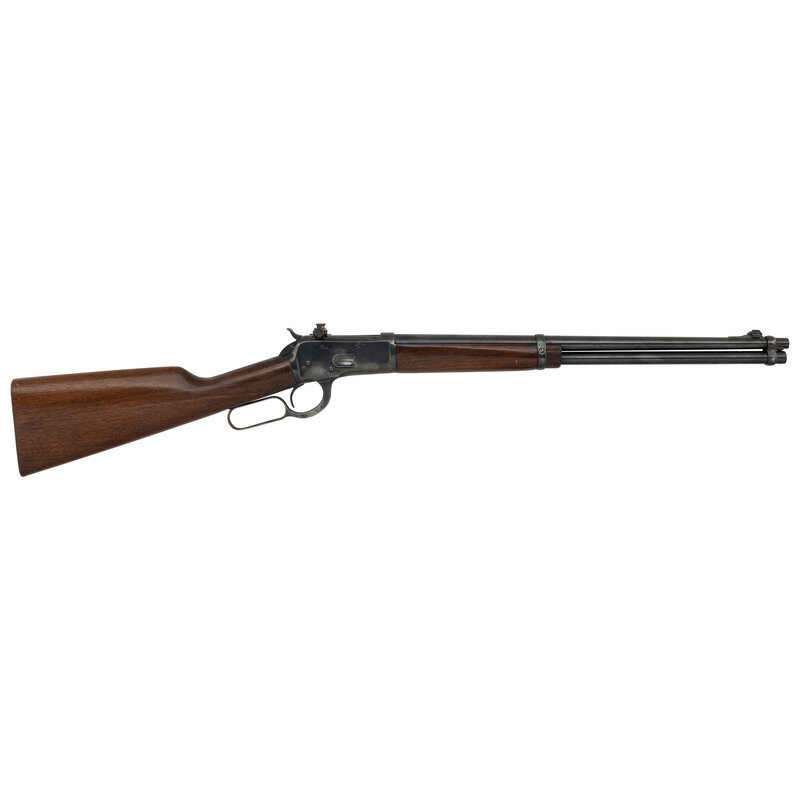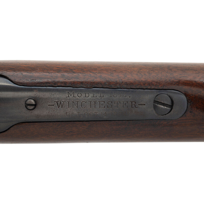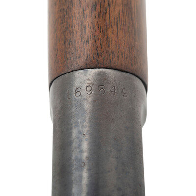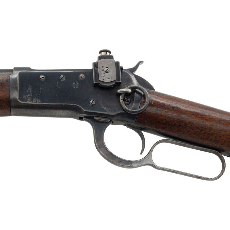 .44 Magnum. 19.75" barrel length. SN: 169549. Blued metal finish. Two piece walnut stock with plain straight grip and forearm. Lever action rifle with Lyman 66MB peep rear sight and Lyman blade front sight. Item features a saddle ring to left side, full tube magazine, and checkered steel shotgun style buttplate. Barrel does not show any Winchester manufacturer marks. Markings include .44 MAGNUM to left side of barrel and 44/MAG to left side of frame. Upper tang is stamped MODEL 1892./WINCHESTER/PAT. OCT. 14. 1884. Serial number has L style mark for the 1 digit.