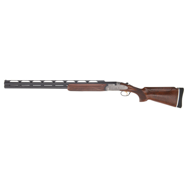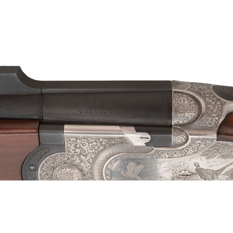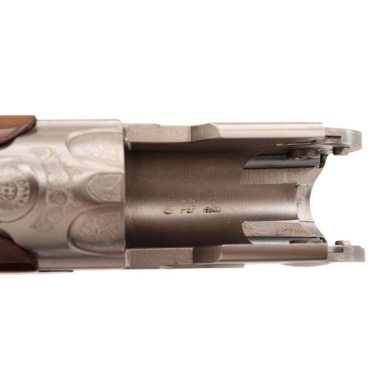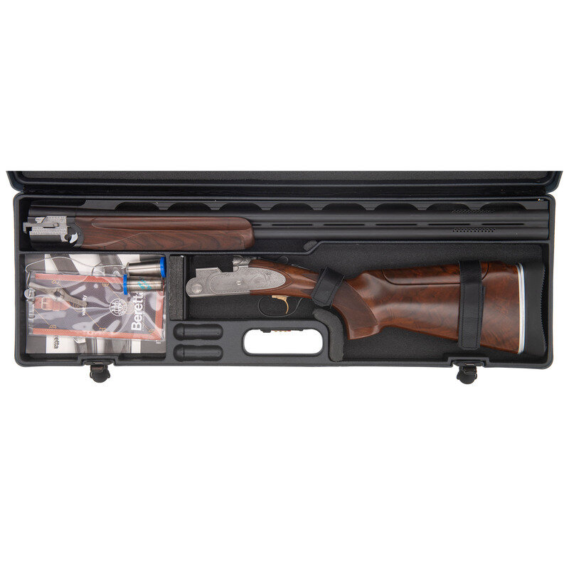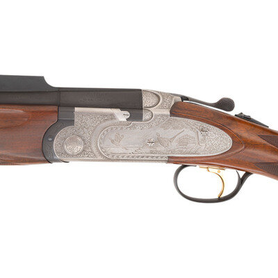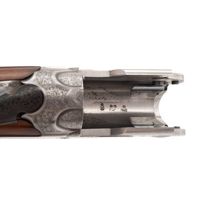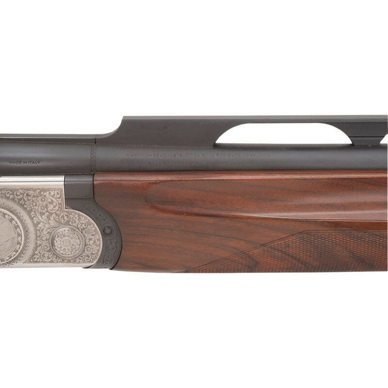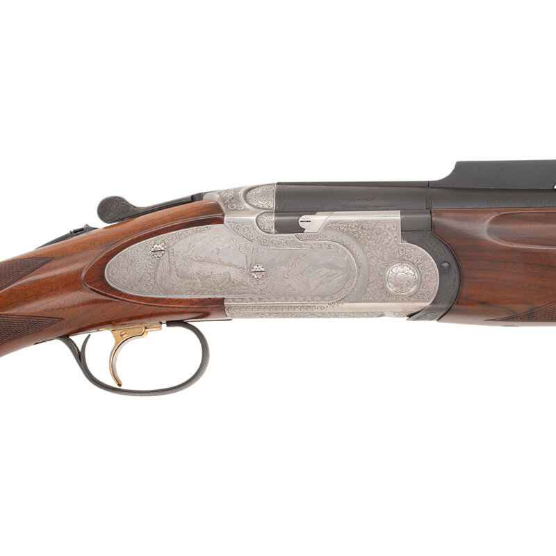 12 gauge with 2 each Full & Modified interchangeable chokes. 29.5" ported barrels with raised ventilated rib. SN: L46858B. Matte blue barrels, engraved bright receiver, checkered forend, checkered pistol-gripped butt with 1" ribbed recoil pad. Length of pull 14.5", adjustable comb currently set at a 1.25" drop and adjustable heel for drop and offset, currently at 1.375". Single select trigger, thumb safety and selector, two sets of removable chokes (full and modified). Action with panel engraved scene of pheasants and grouse with tight banknote style scroll boarders. Includes a total of 4 choke tubes, tube wrench and plastic Beretta case with paperwork.