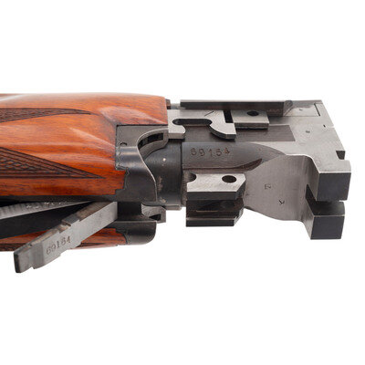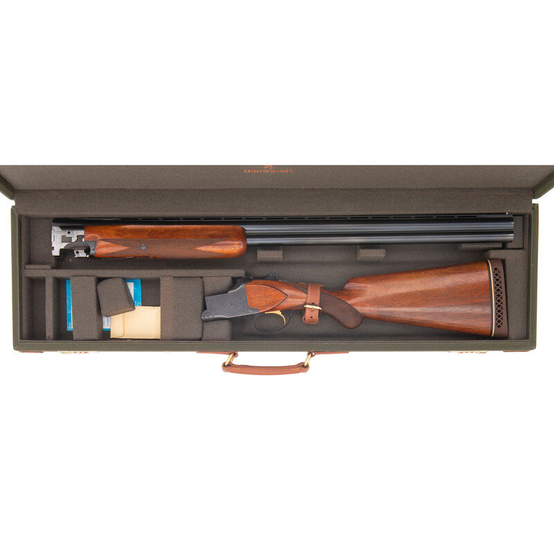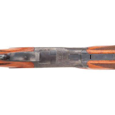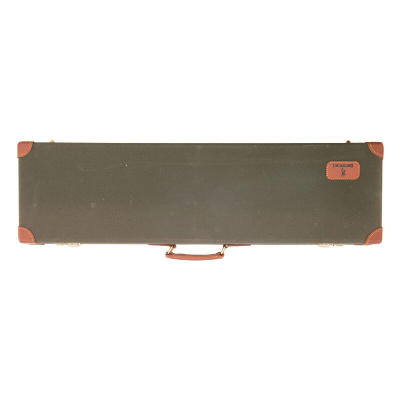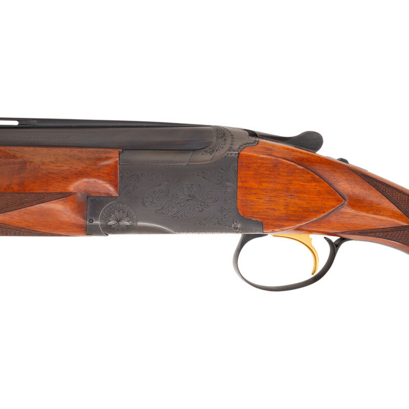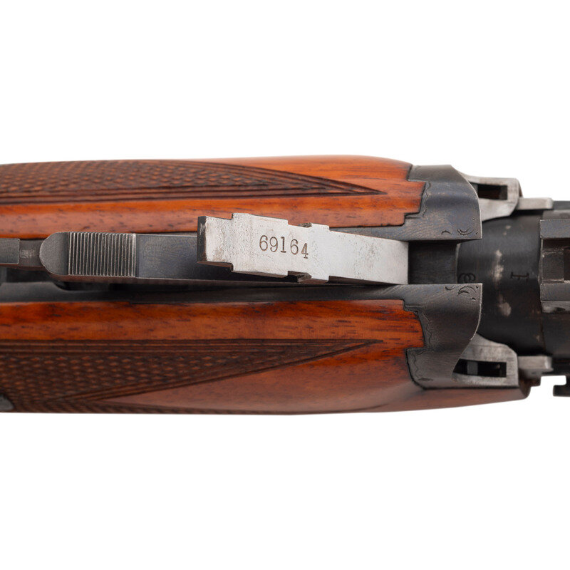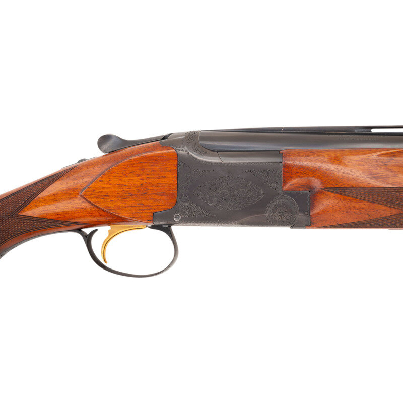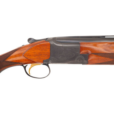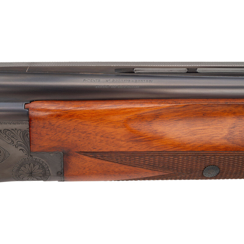 12 gauge choked modified. 30" barrels with ventilated rib and 2 3/4" chambers. Length of pull 14.75", drop at comb 1.125", drop at heel 1.5". SN: 69164. Blued finish, gold plated single select trigger, checkered forend, checkered pistol-gripped butt with Pachmayr White Line recoil pad. Box lock action lightly engraved with flowing foliate motifs. Single select trigger, thumb safety and barrel selector on tang, white sight beads at mid-rib and muzzle. Belgian proofs, barrels marked BROWNING ARMS CO St LOUIS Mo & MONTREAL PQ and MADE IN BELGIUM and bottom of frame marked BROWNING. Matching serial numbers throughout. Includes a Browning sectionalized leather trimmed shotgun case.
