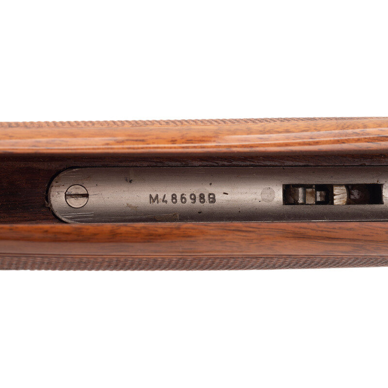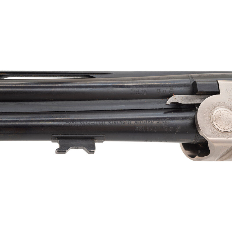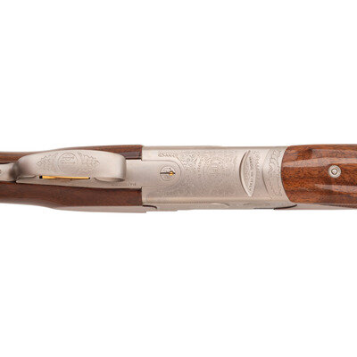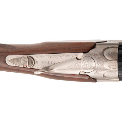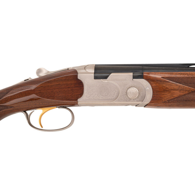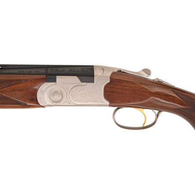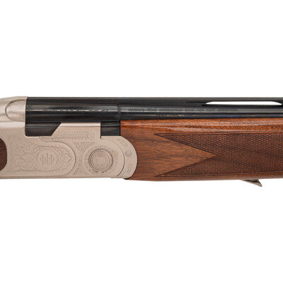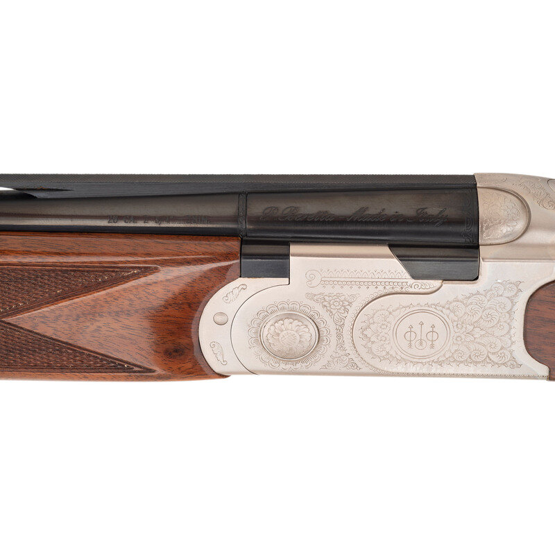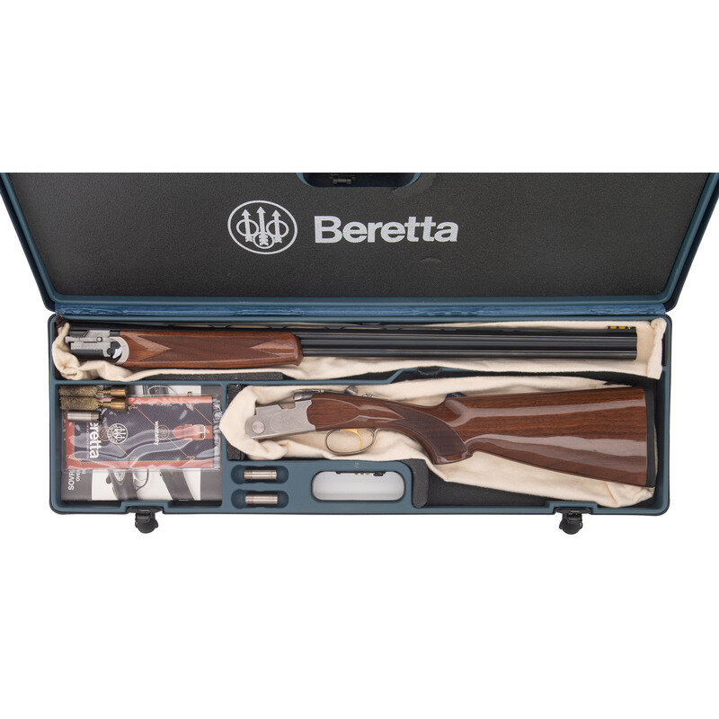 28 Gauge with Improved Cylinder and Modified chokes installed. 28" barrels with 2 3/4" chambers, Length of pull 14.5", drop at comb 1.25", drop at heel 2", and ventilated rib. SN: M48696B. Blued barrels, engraved bright receiver, checkered half beavertail Schnabel tipped forend, checkered pistol gripped butt with rubber butt pad. Single select trigger, tang mounted thumb safety and barrel selector, automatic ejectors, five interchangeable choke tubes with two Improved and two Modified tubes and one Full, fiber optic front sight insert. Includes plastic case, paperwork, chamber mop snap caps and Beretta multi-tool shell extractor and screwdriver.
