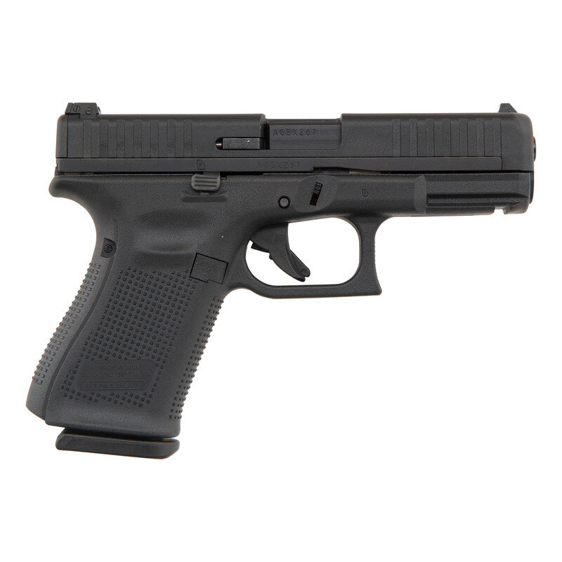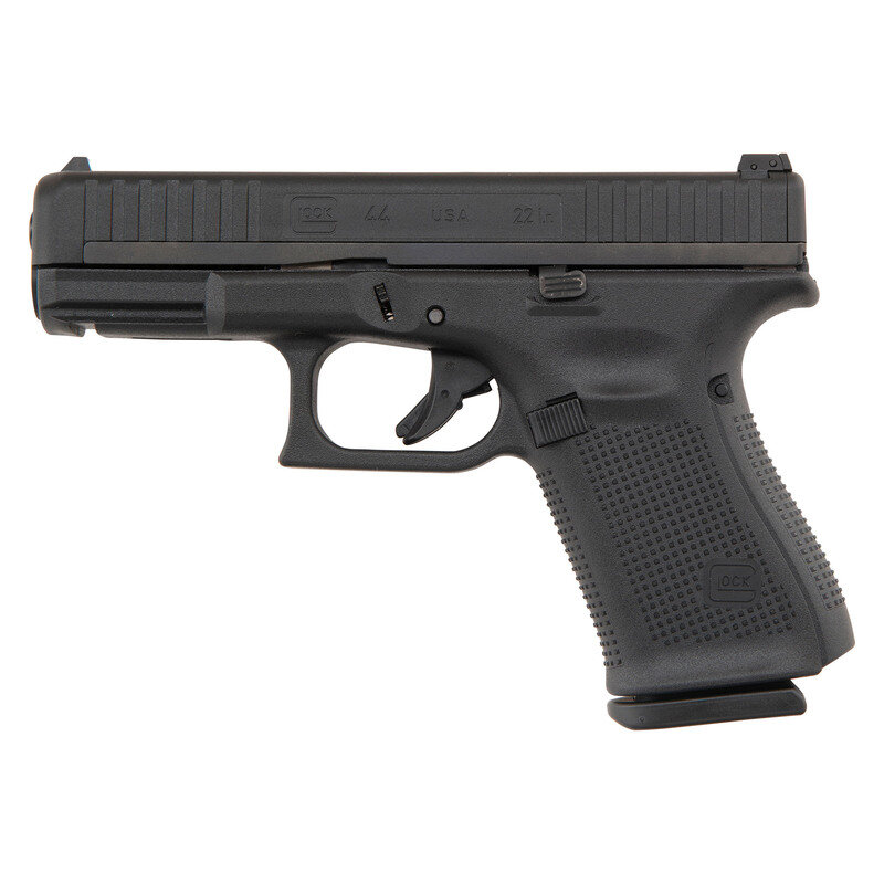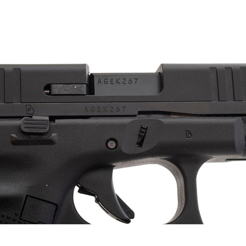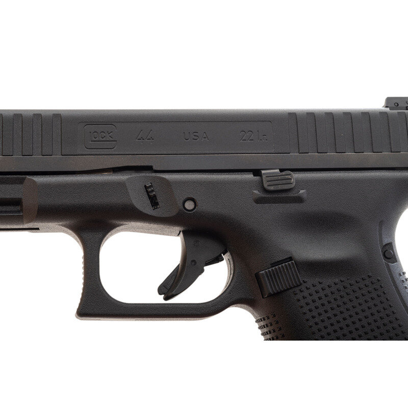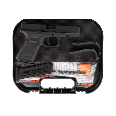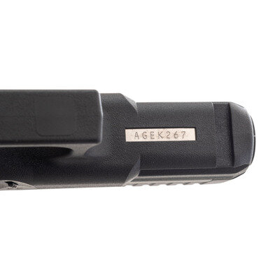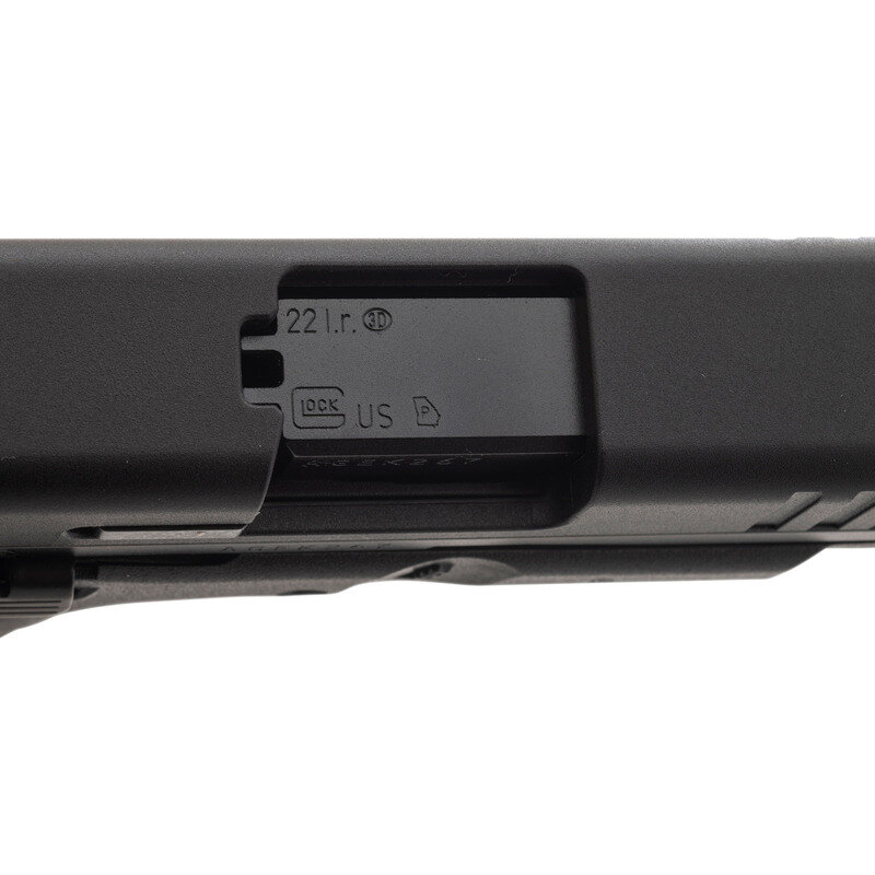 .22 LR. 4.02" barrel length. SN: AGEK267. Black Glock nDLC finish featuring a black synthetic frame and slide, accessory rail to forward slide, and Glock factory adjustable target rear and front blade sights. Simple-blowback operated striker action autoloading pistol fed by detachable single-stack magazines. Item shows standard Glock USA markings, and comes in a black plastic hard case with two magazines, two alternate backstraps, cleaning kit and cable lock in package, and the owner's manual in package.