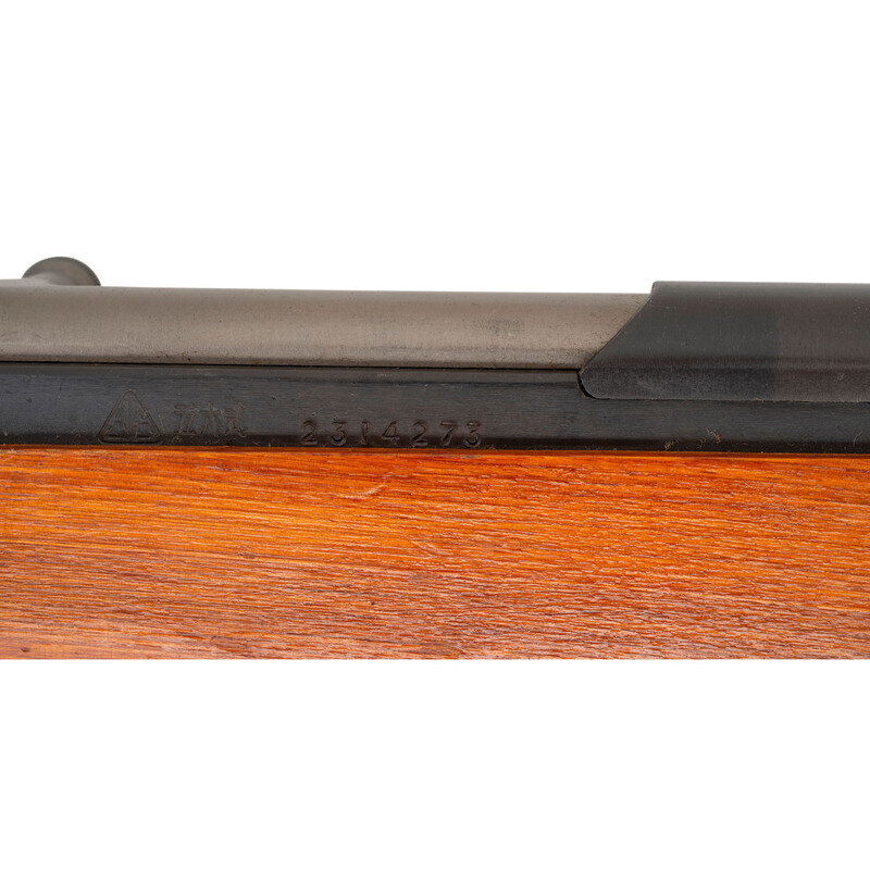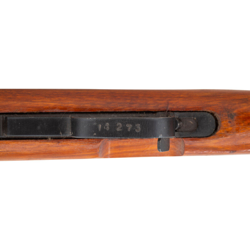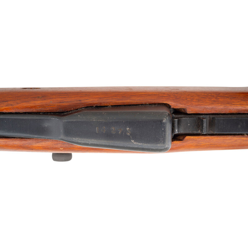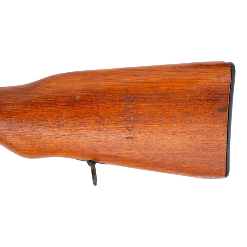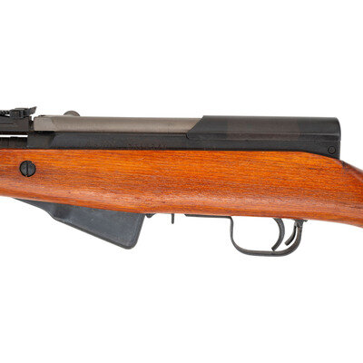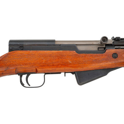 7.62x39mm. 20.5" barrel length. SN: 2304273. Black blued metal finish. Hardwood stock has a plain semi pistol grip and forearm, with handguard and grasping grooves. Semi automatic rifle with adjustable tangent notch rear sight and globe post front sight. Item features an integrated magazine, cleaning rod, side sling loops, and a trapdoor buttplate with cleaning kit. Markings include Chinese characters and a triangle 316 mark. Stock is marked with partial serial number. Item is missing bayonet.