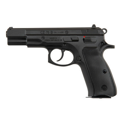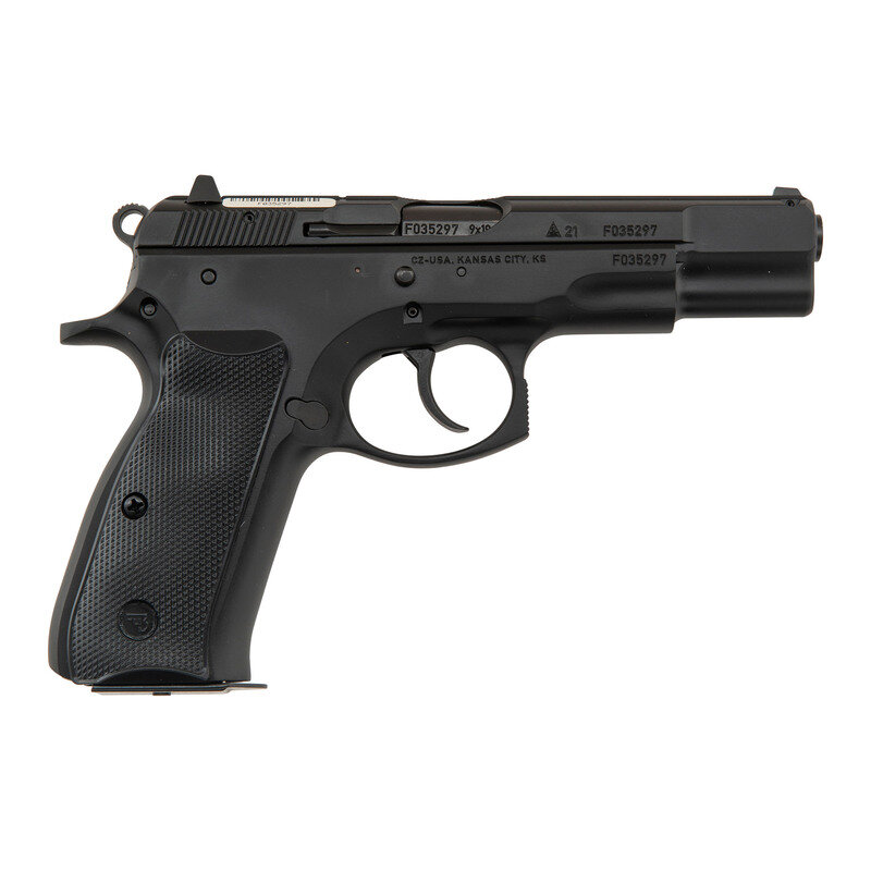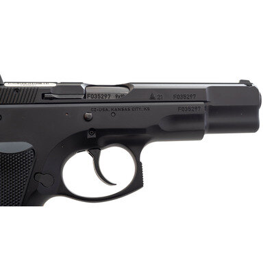 9mm Para. 4.6" barrel length. SN: F035297. Black Nitron finish overall mounting checkered black synthetic CZ logo grips and triple dot sights. Short recoil operated DA/SA autoloading pistol fed by detachable double stack magazine. Item exhibits standard make and model markings including CZ-U.S.A. KANSAS CITY. KS importer marking. Comes in a matching black synthetic magazine with two magazines, the owner's manual, cable lock in package, nylon bore brush, and synthetic cleaning rod.