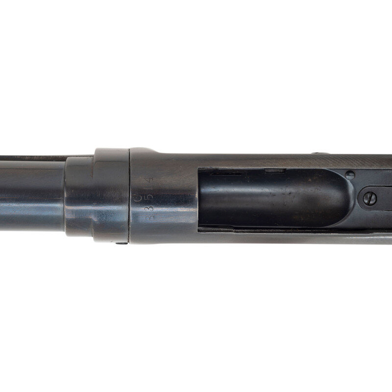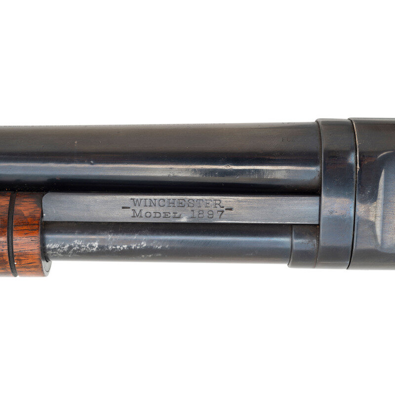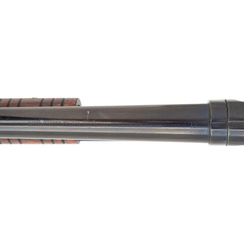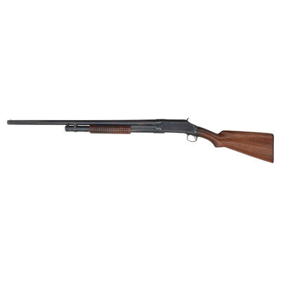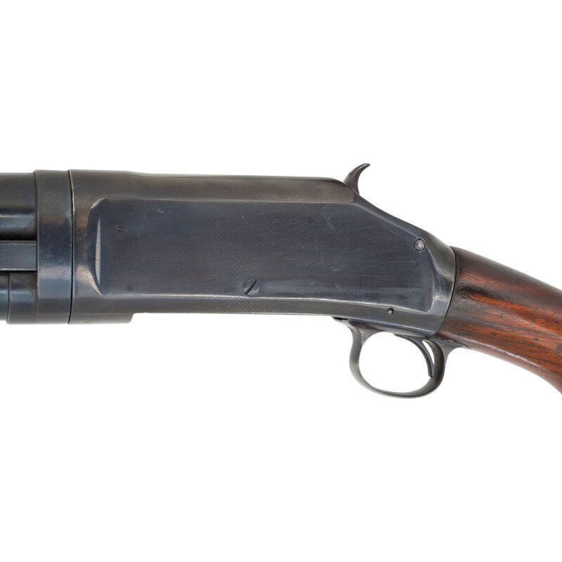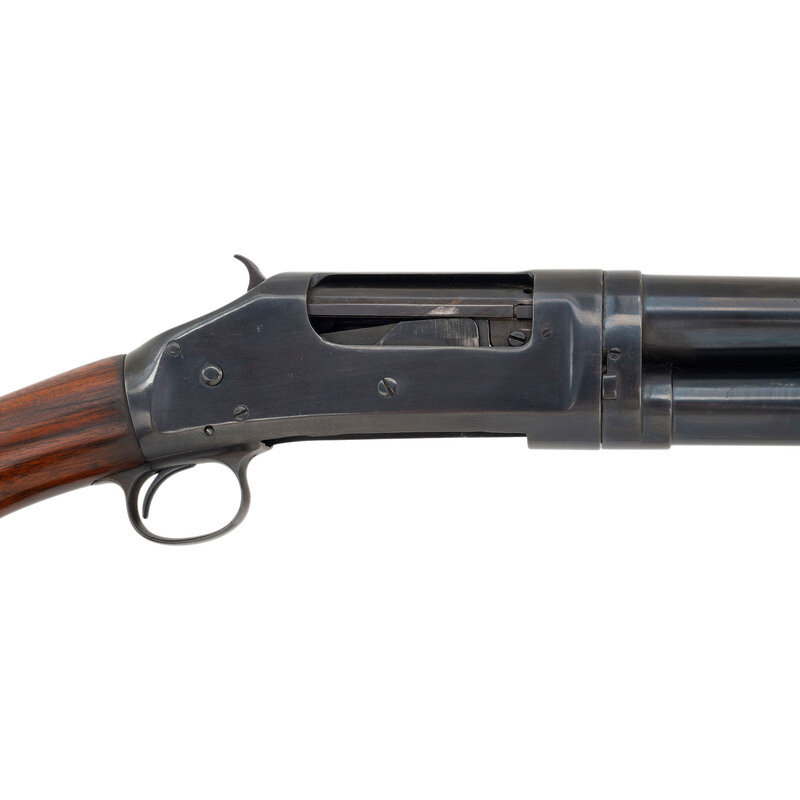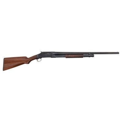 12 gauge. 26" barrel length. Full choke. SN: 83514. Blued metal finish. Two piece walnut stock has a plain semi pistol grip and corncob grooved forearm. Slide action hammer shotgun with a brass bead front sight, tube magazine, and hard rubber buttplate.