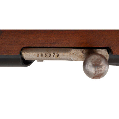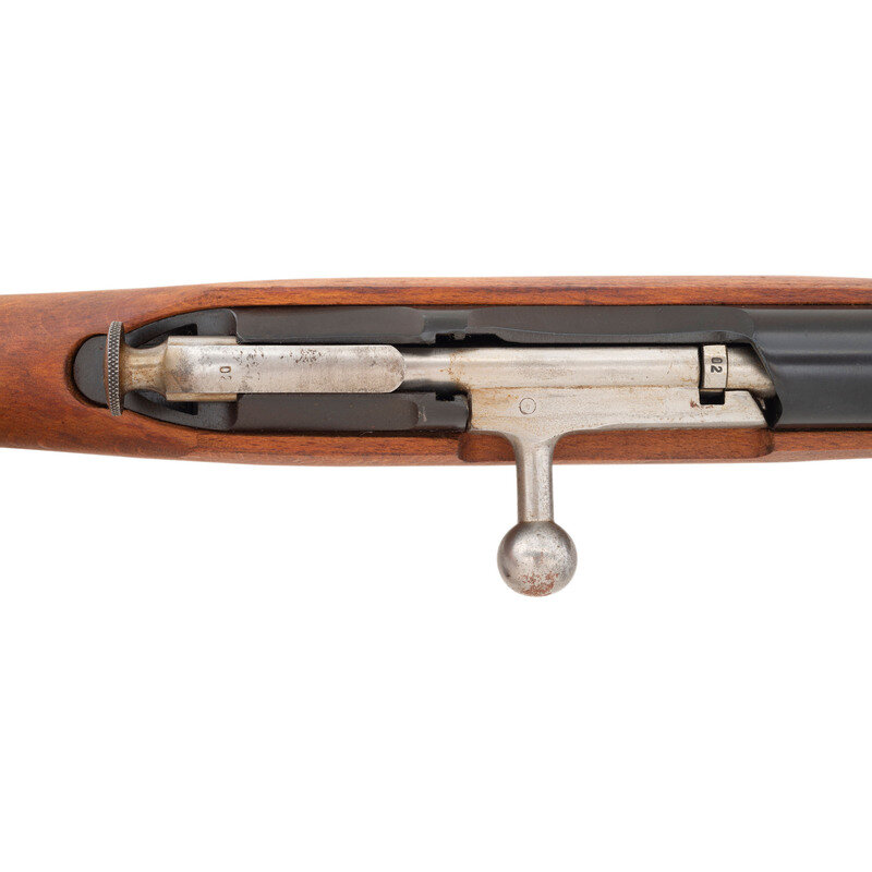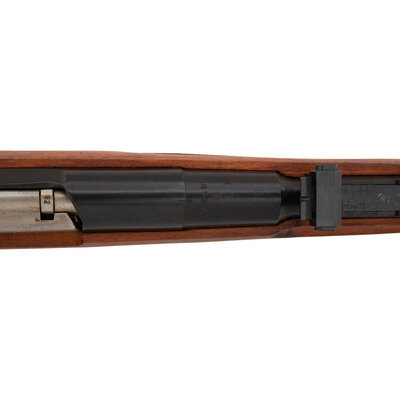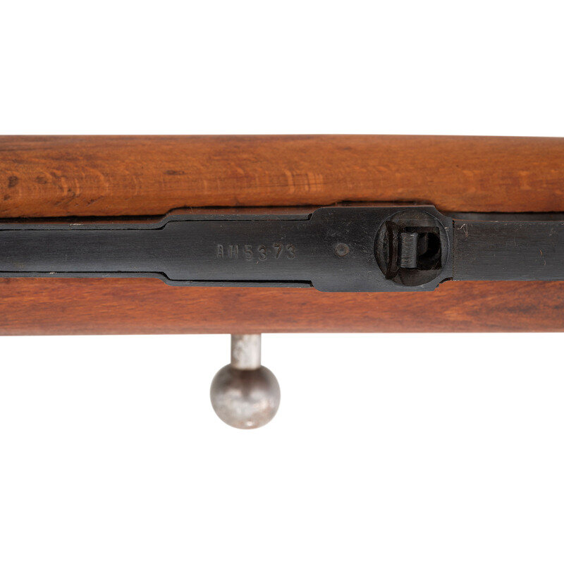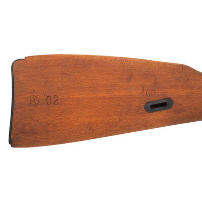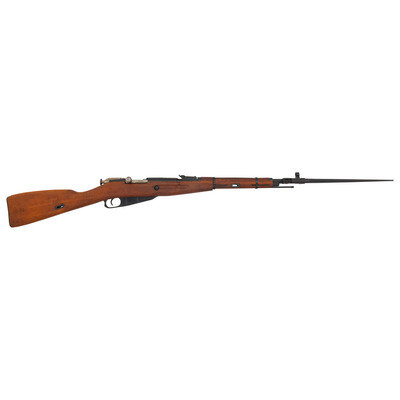7.62x54mmR. 21" barrel length. SN: AH5373. Black blued military finish with polished steel bolt. Hardwood stock has a plain straight grip and forearm, with handguard and grasping grooves. Bolt action rifle with tangent notch rear sight and globe post front sight. Item features an integrated magazine, fixed folding spike bayonet, sling loops, and a slotted head cleaning rod. Markings include 02 Hungarian marks, as well as a 1952 date and Soviet sickle and hammer mark. Stock is also stamped with Hungarian B and 02 cartouches to left side.