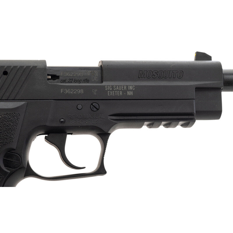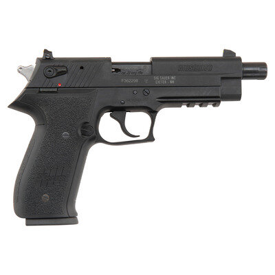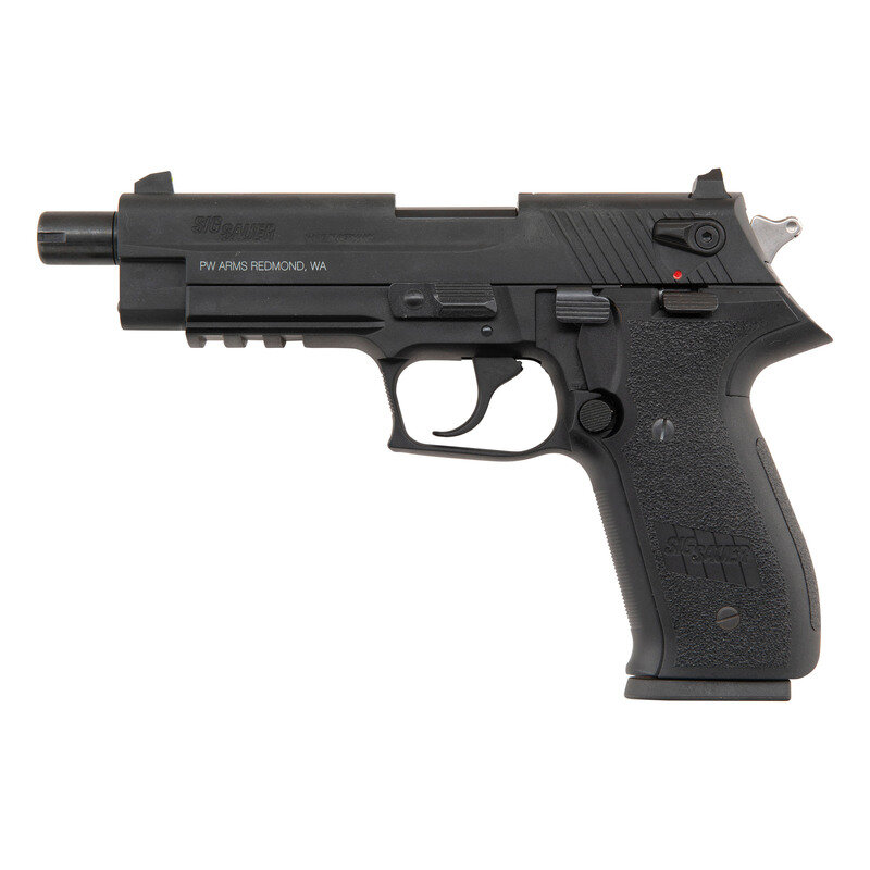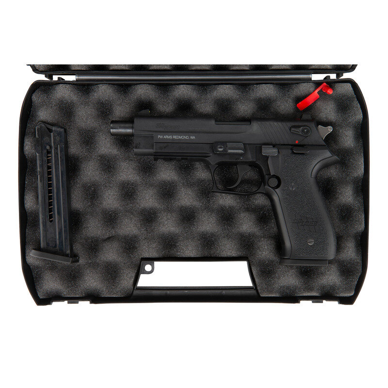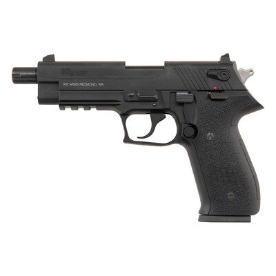 .22 LR. 4.75" barrel length. SN: F362298. Black Nitron finish to metal parts with black synthetic frame and grip panels featuring a threaded muzzle and triple yellow dot sights with drift adjustable rear notch. Simple blowback operated DA/SA autoloading pistol fed by detachable single stack magazines and featuring a frame mounted accessory rail. Item shows German proof markings to major components and the importer marking PW ARMS REDMOND, WA on the left slide. Comes in a matching black synthetic hard case with two magazines, the owner's manual, and the tool kit. Contained in the latter kit are a threading wrench, snap cap, two front sight options, sight adjustment tool, and an extra recoil spring.