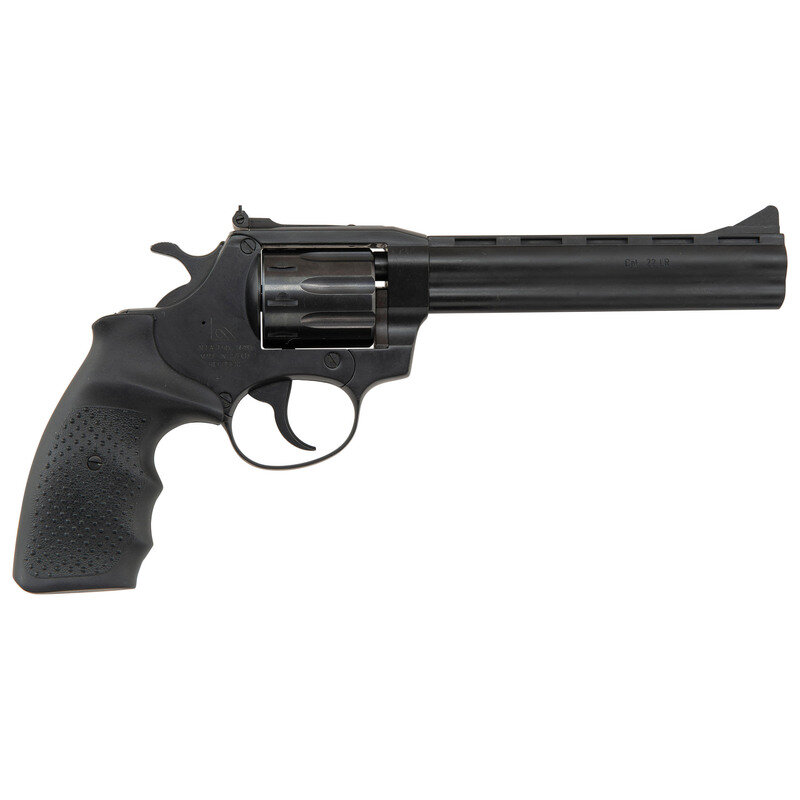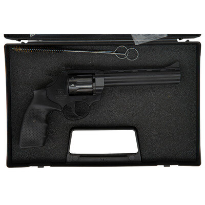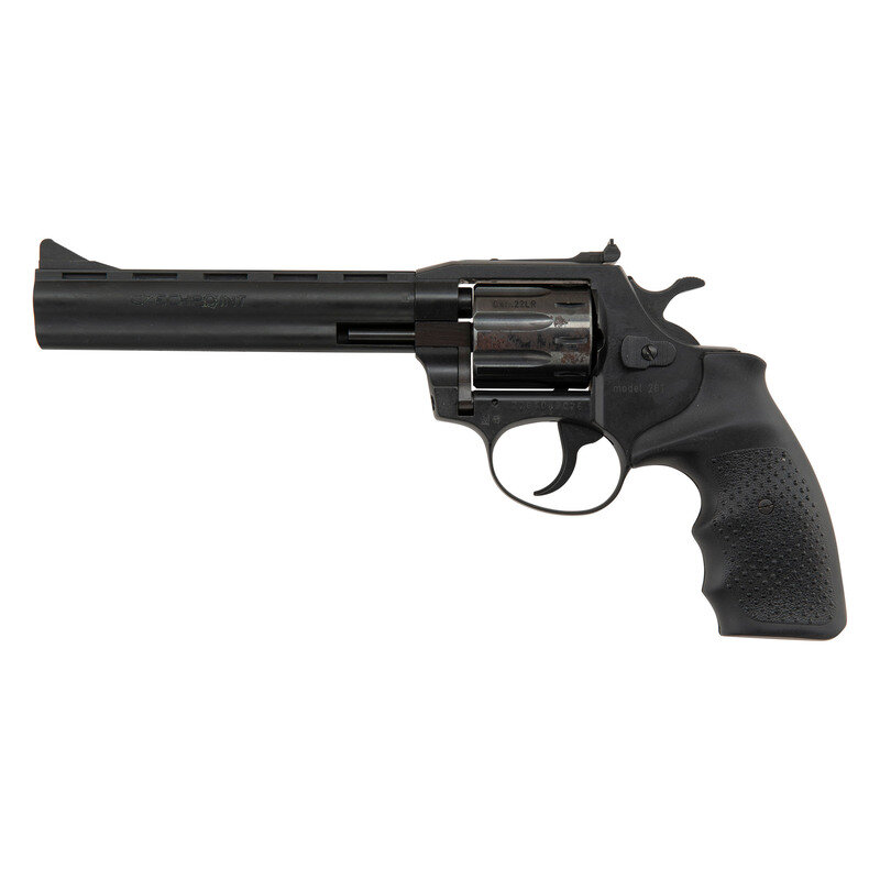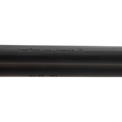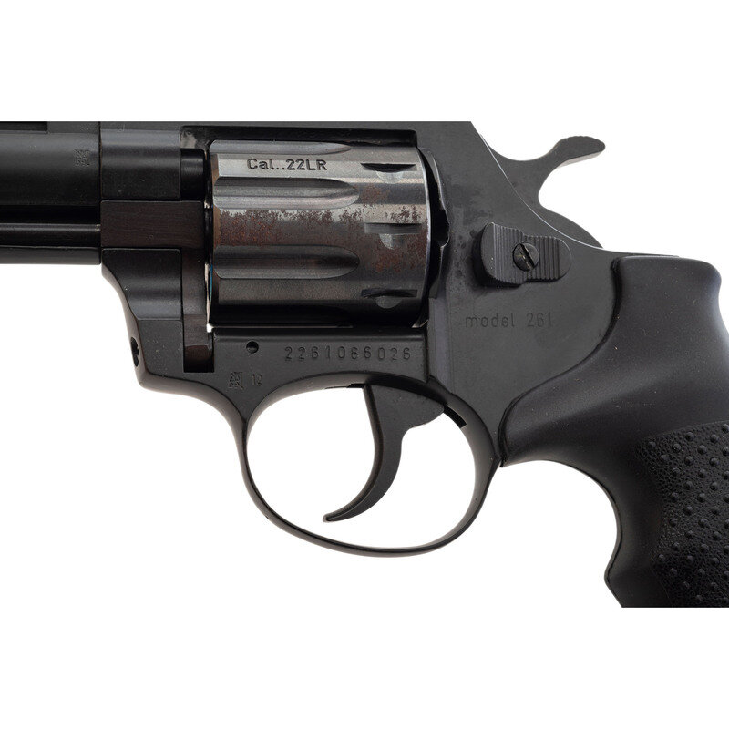 .22 LR. 5.875" barrel length. SN: 2261066026. Black Nitron finish overall with black rubber grips featuring pebble texturing and mounting adjustable target rear notch and matted front blade sights. Double action nine-shot hand ejector revolver featuring a full length underlug and matted barrel ramp. Left barrel is struck CZECHPOINT with the underside of the lug marked CzechPoint. Inc., Knoxville, TN. The left side of the frame is marked model 261 with the left frame showing Czech proof markings. Item comes in a black synthetic case with factory test target, owner's manual, and both chamber and bore cleaning brushes.