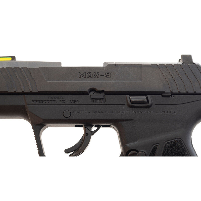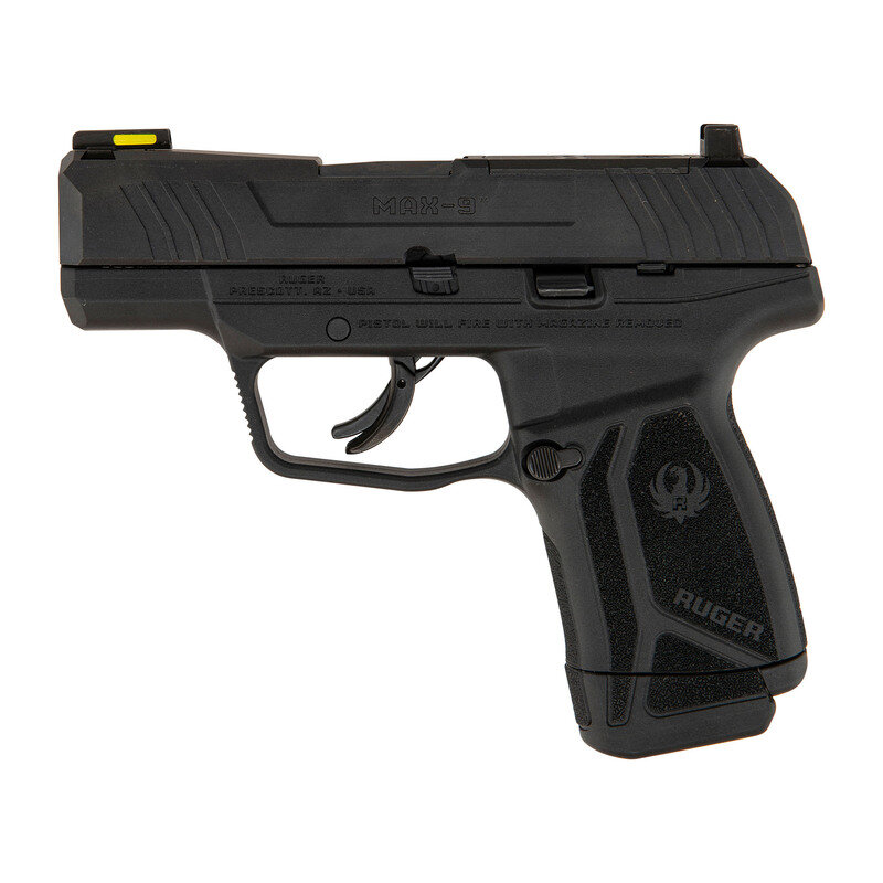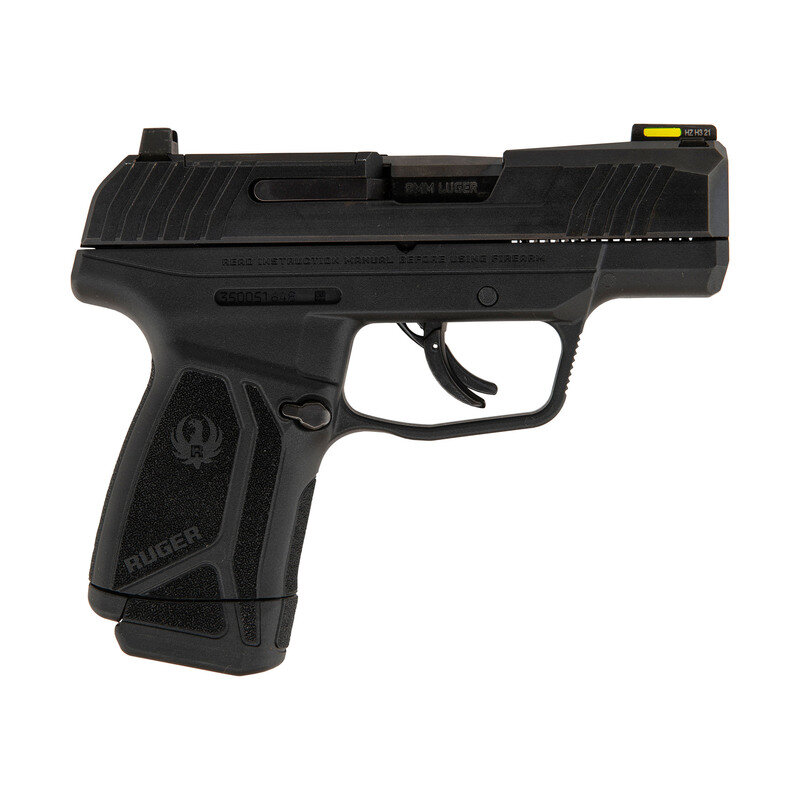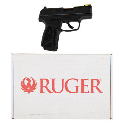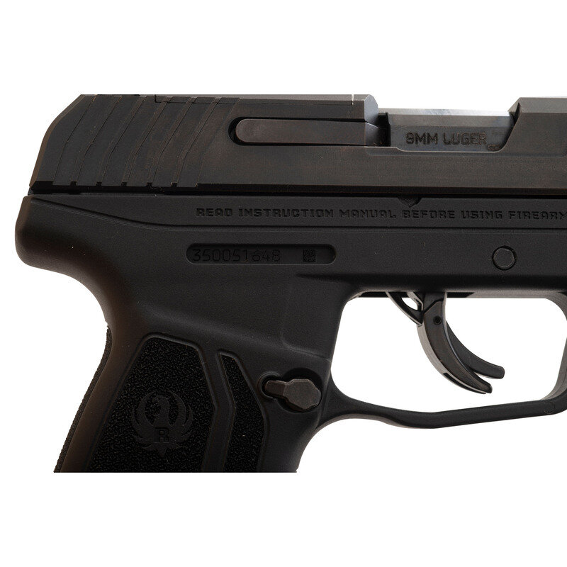 9mm Para. 3.2" barrel length. SN: 350051648. Black Oxide finish to metal parts with black synthetic frame, and mounting green fiber optic front blade and flat black rear notch sights. Short recoil operated striker action autoloading pistol fed by detachable double-stack magazines. Item features an optics ready slide with a cover plate secured in place. Standard make and model markings appear overall. Item lacks accessory rail to forward frame. Comes in a matching RUGER marked cardboard box with one flush fitting magazine, one with grip extension, owner's manual, and a cable lock in package.