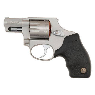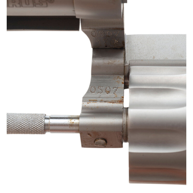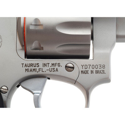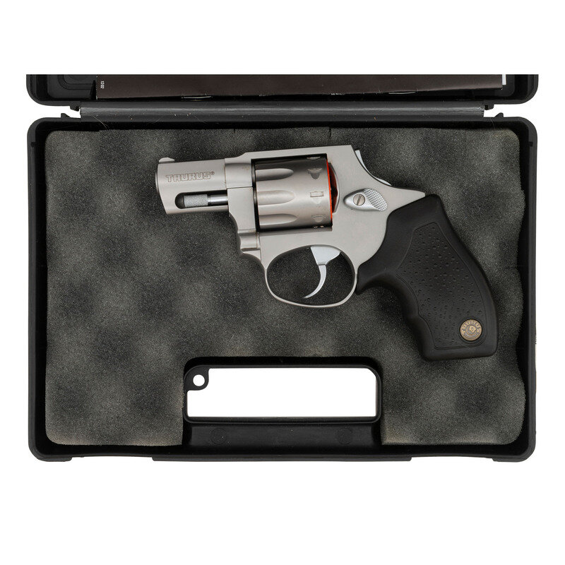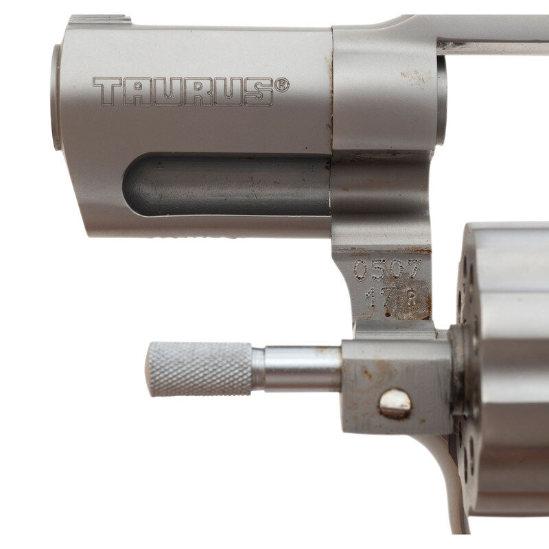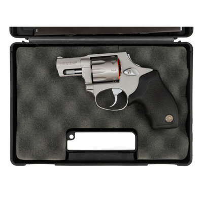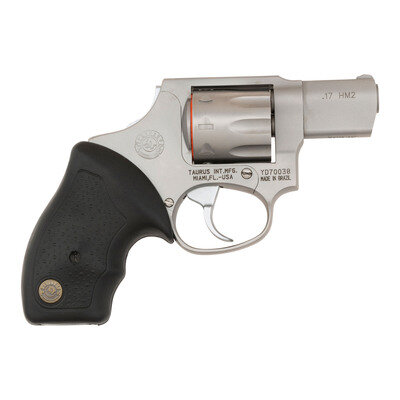 .17 HM2. 1.875" barrel length. SN: YD70038. Matte stainless steel finish overall mounting pebble texture black synthetic Taurus medallion grips. DAO nine-shot hand-ejector revolver mounting topstrap notch and matted front blade sights. Item shows standard make and model markings, including importer mark reading TAURUS INT. MFG./MIAMI, FL.-USA. Item comes in a black synthetic TAURUS marked hard case with the owner's manual and two internal safety lock keys.