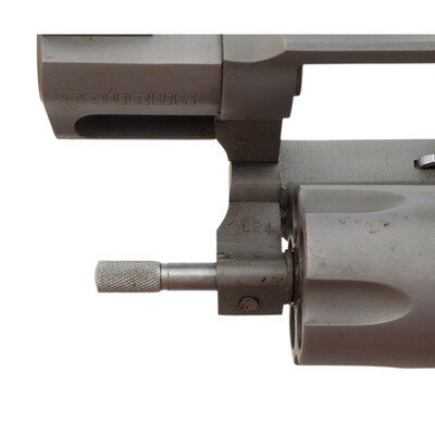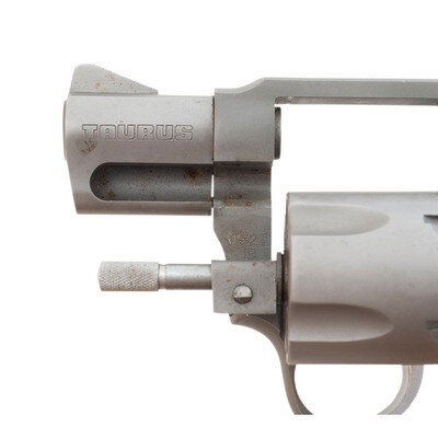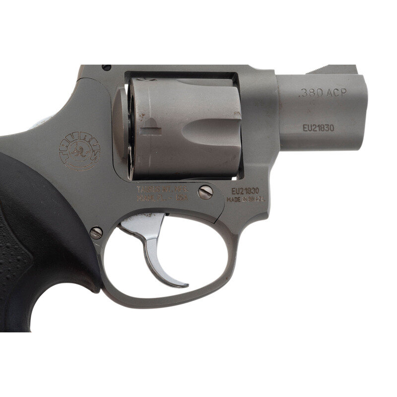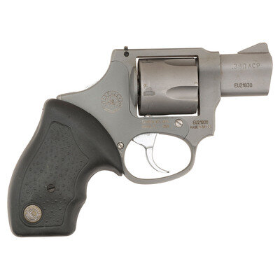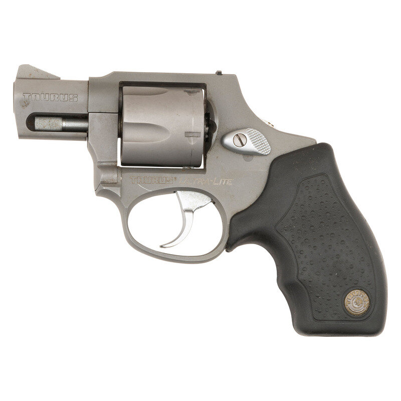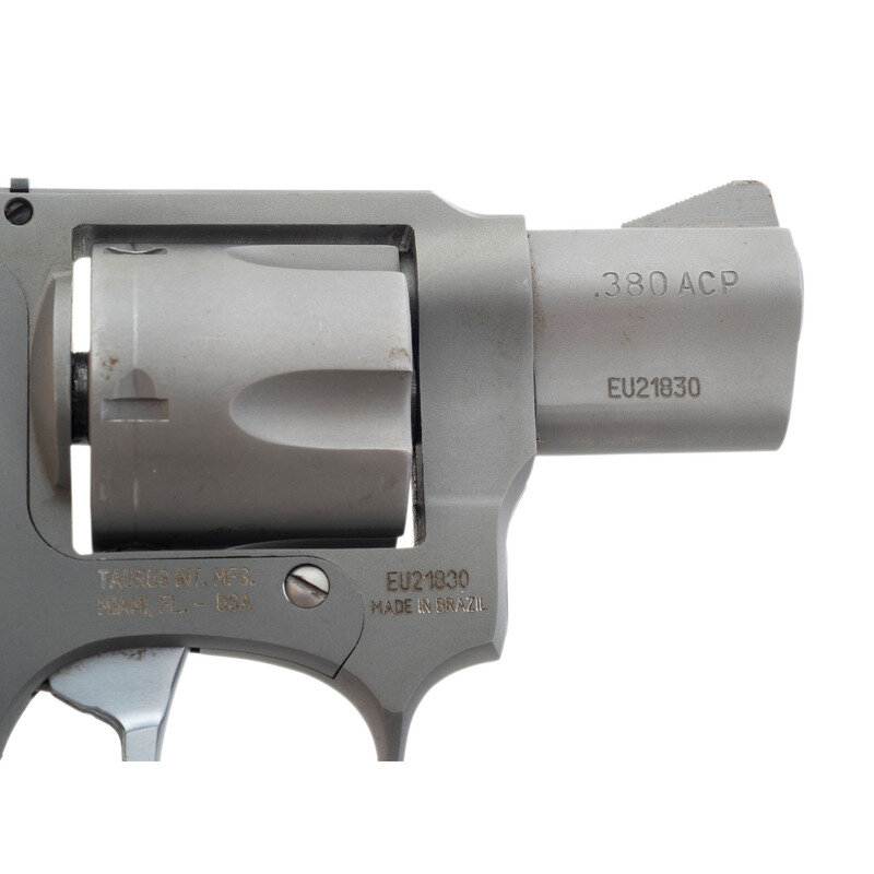 .380 ACP. 1.75" barrel length. SN: 062418. Matte stainless finish overall with Anodized frame mounting Taurus medallion black rubber grips and featuring a bobbed hammer. Double action five-shot hand-ejector revolver mounting rear notch and matted front ramp sights. Left frame is marked TAURUS ULTRA-LITE with the sideplate exhibiting import marks reading TAURUS INT. MFG./MIAMI, FL. - USA.