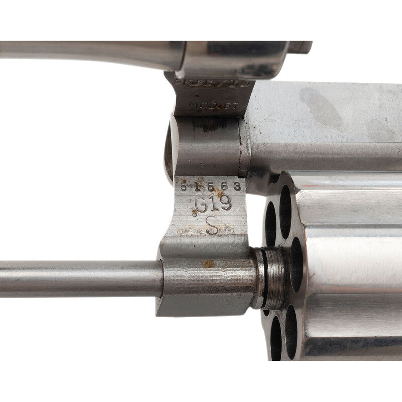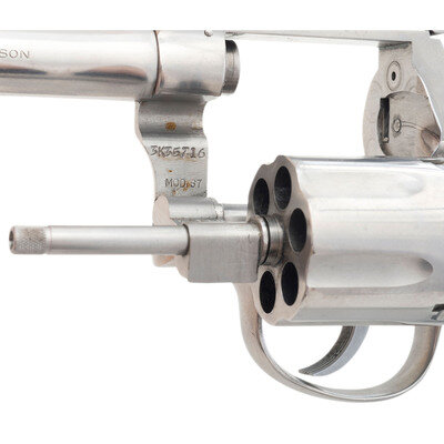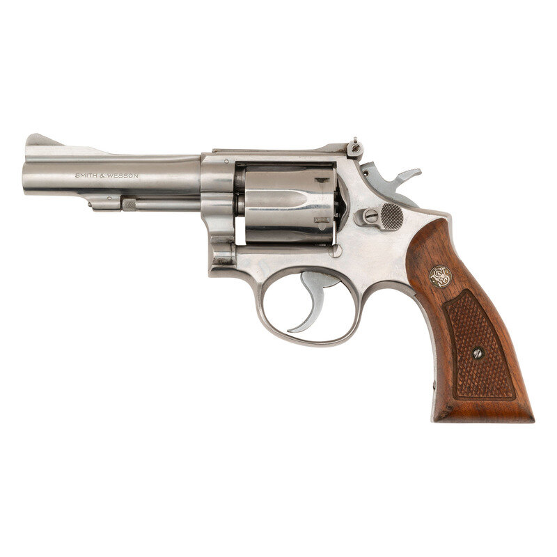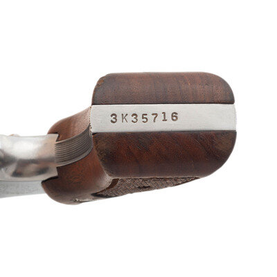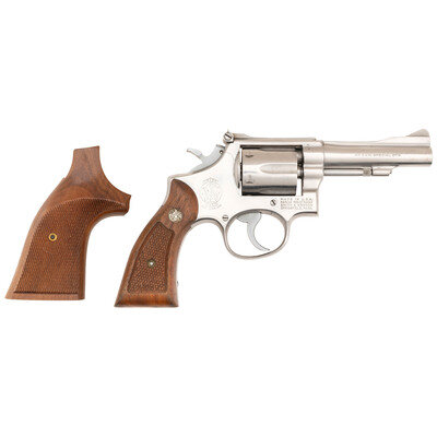 .38 Special. 4" barrel length. SN: 3K35716. Brushed stainless steel finish overall with matte hammer and trigger mounting checkered Walnut Smith & Wesson medallion grips. Double action six-shot hand ejector revolver featuring a pinned barrel on a three screw frame. Sights consist of an adjustable rear notch and Baughman Quick Draw front ramp atop a matted barrel rib and topstrap. Markings include Smith & Wesson monogram trademark to the sideplate, four-line address to the right frame, and standard make and caliber markings to the barrel flanks. Comes with a pair of oversize checkered walnut grips with sticker to interior reading A Genuine/Herrett's/Model RK.
