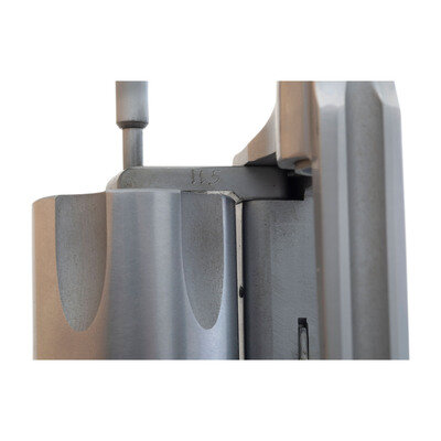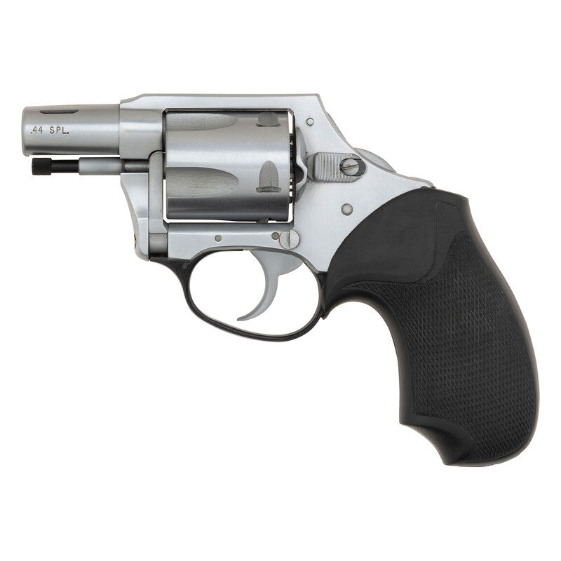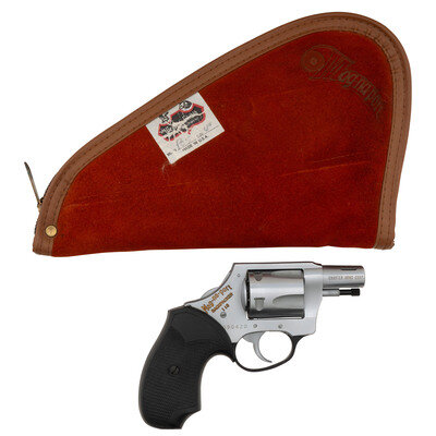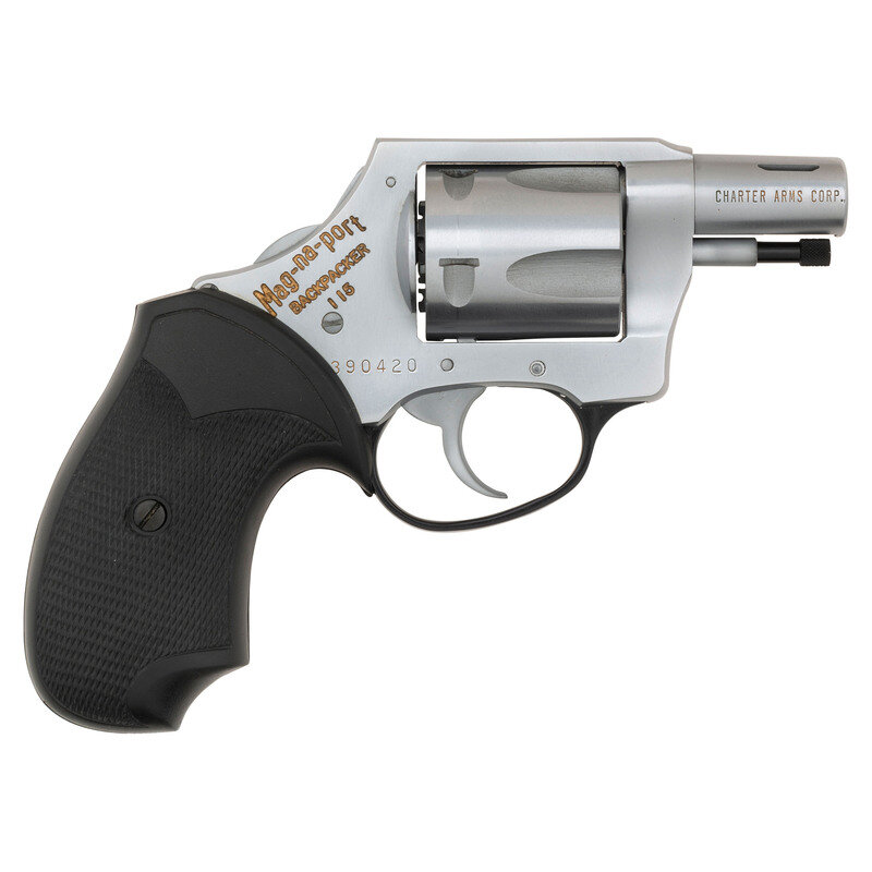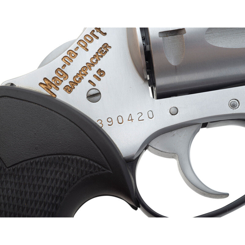 .44 Special. 1.875" barrel length. SN: 390420. Brushed stainless steel finish with black anodized triggerguard, black rubber Pachmayr grips, and a ported barrel. DAO five-shot hand ejector revolver featuring topstrap notch only with no front sight blade. Right barrel shows the maker marking CHARTER ARMS CORP. The right frame is marked Mag-na-port/BACKPACKER/115 in gold letters. Comes in a suede leather Mag-na-port marked soft case with a shoulder patch.