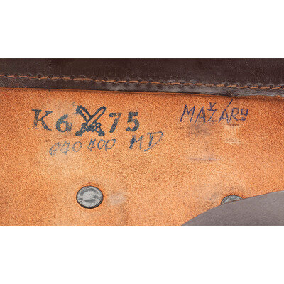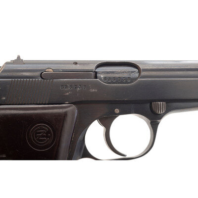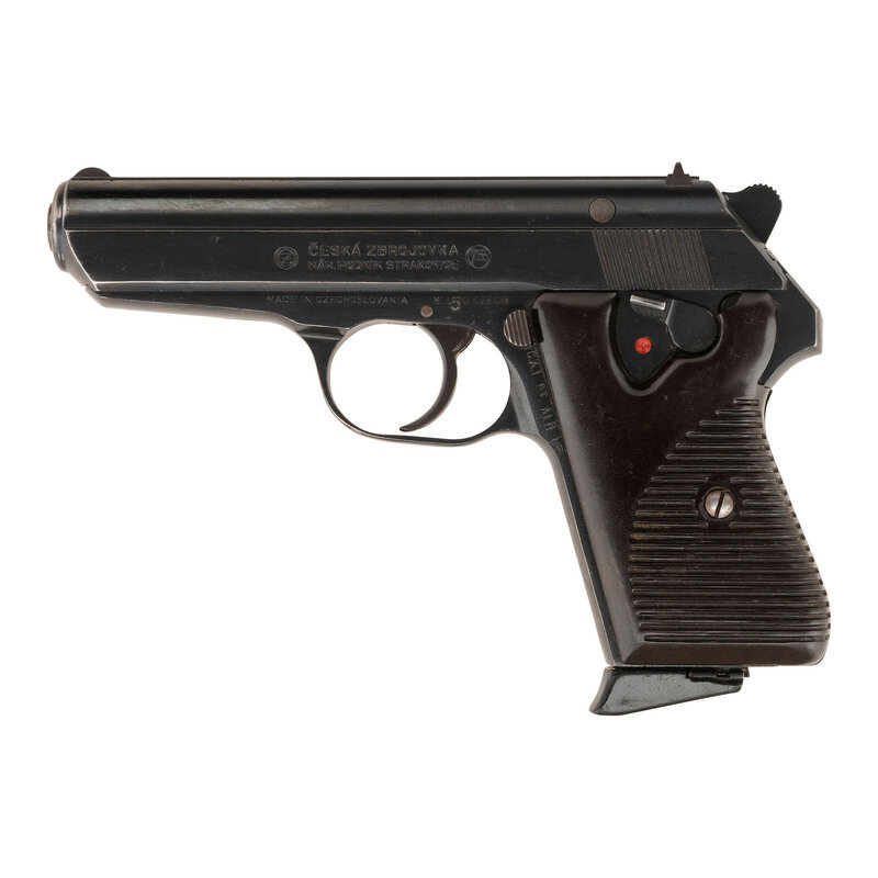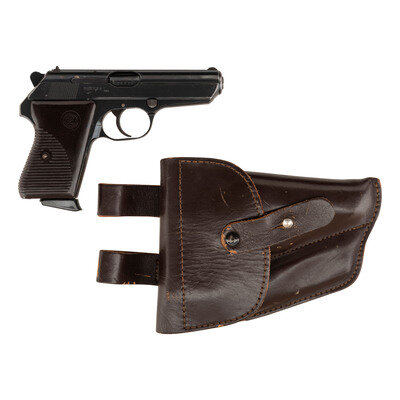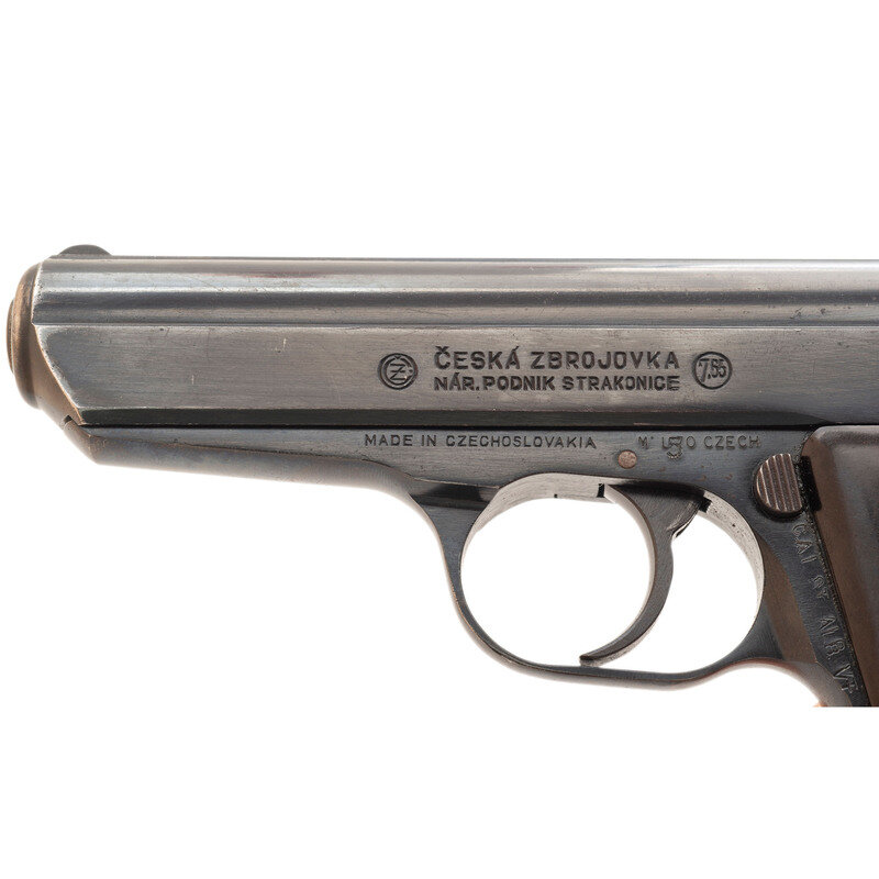 .32 ACP. 3.78" barrel length. SN: 696238. Blued metal finish overall mounting two-piece Bakelite grips and mounting standard low-profile sights. Simple blowback operated DA/SA autoloading pistol fed by detachable single stack magazines. Left slide displays the manufacturer marking CESKA ZBROJOVKA/NAR. PODNIK STRAKONICE followed by 7.65 caliber marking. Left frame is struck MADE IN CZECHOSLOVAKIA with model marking for Model 70 overstruck to 50. Forward gripstrap features importer marking C.A.I. ST ALB VT. Item comes in a Czech military style leather holster with the interior flap struck with the Czech {Crossed Swords} stamp flanked by K6 and 75 date markings. The flap has also been marked with a previous owner's name in ballpoint pen, along with a possible service number reading G70700MD and the name MAZARY. Comes with one magazine.
