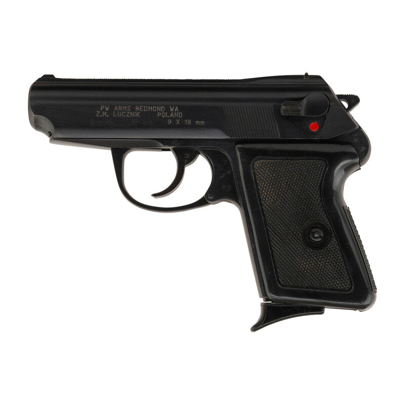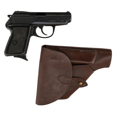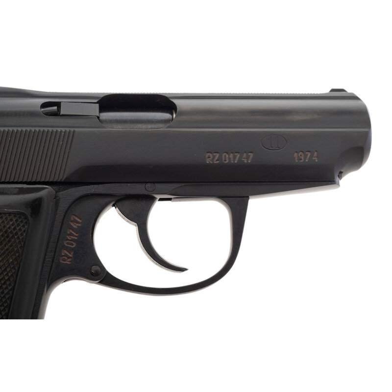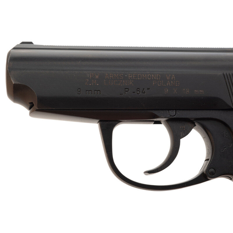 9x18mm. 3.3" barrel length. SN: RZ01747. Blued metal finish overall mounting two-piece checkered black synthetic grips and low-profile standard sights. Simple blowback operated DA/SA autoloading pistol fed by detachable single stack magazines and featuring a slide mounted safety/de-cocker lever. Markings include the Circle 11 factory marking on the right slide beside a manufacture date of 1974. Left slide displays the caliber and model marking 9mm "P-64" along with the importer mark PW ARMS REDMOND WA/Z.M. LUCZNIK POLAND/9X18mm. Serial numbers match on the frame and slide. Item comes with a leather holster showing a date of 1973 with a similar Circle 11 stamp and additional production stamps. Included with the pistol are one magazine and the cleaning/disassembly multitool.