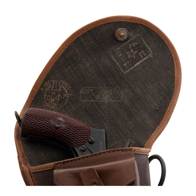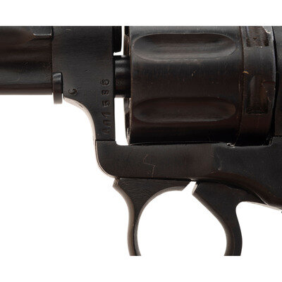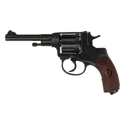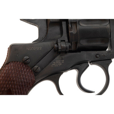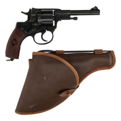 7.62x38mmR. 4.5" barrel length. SN: NG02122 (Importer assigned). Blued metal arsenal refinish overall with checkered Bakelite grips and lanyard loop to butt. Double action loading gate revolver featuring a seven-shot cylinder and Nagant patented gas seal mechanism. Sights consist of a semi-circular rear notch and dovetailed front blade sight. Left frame is struck with the Factory original serial number which corresponds to the Cyrillic number AL1586, and matches on the cylinder and frame. Left frame further shows the {Arrow within Circle} marking of the Izhevsk Arsenal above the date marking 1943. Item shows scattered Soviet inspection markings along with boxed re-arsenal stamps to the left frame and sideplate. Right frame exhibits an importer assigned serial number and the importer marking NAGANT 1895/7,62 NAGANT CAL./MADE IN RUSSIA/C.D.I. SWAN. VT. Item comes in a post-war Kirza (Soviet synthetic leather) holster with visible inspection stamps to the flap. Included in the holster is the blued cleaning rod with visible Soviet arsenal marks.