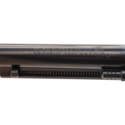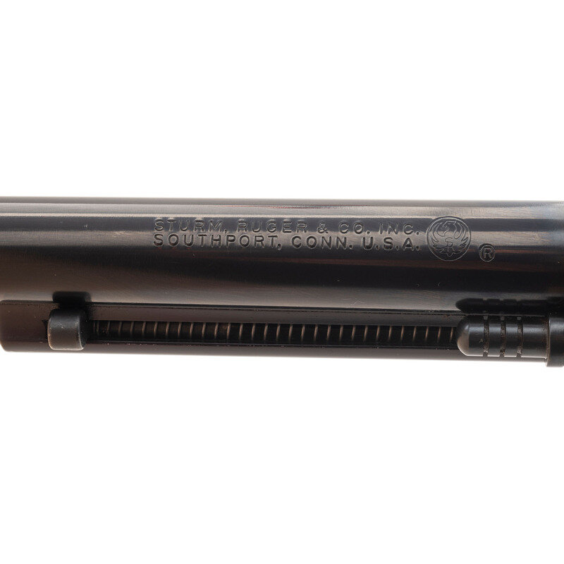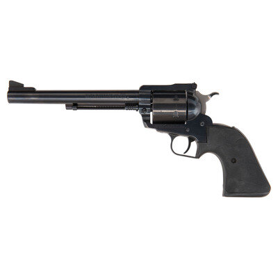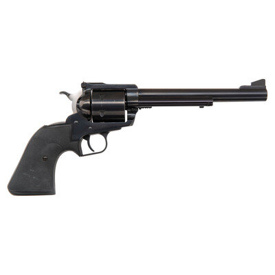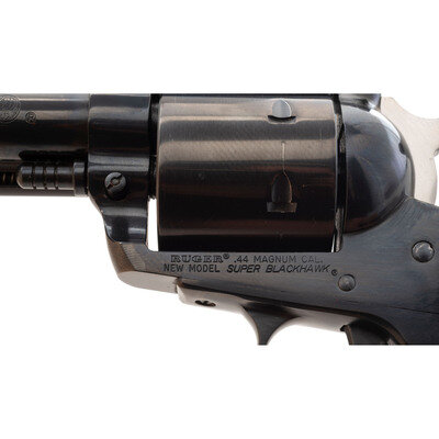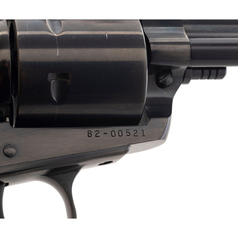 .44 Magnum. 7.5" barrel length. SN: 82-00521. Blued metal finish overall with polished hammer flanks, round cylinder, and mounting black rubber Pachmayr grips. Single-action loading gate six-shot revolver with transfer bar safety mechanism, and mounting adjustable rear notch and matted front blade sights. Standard markings including NEW MODEL SUPER BLACKHAWK to the left frame and two-line address on the barrel.