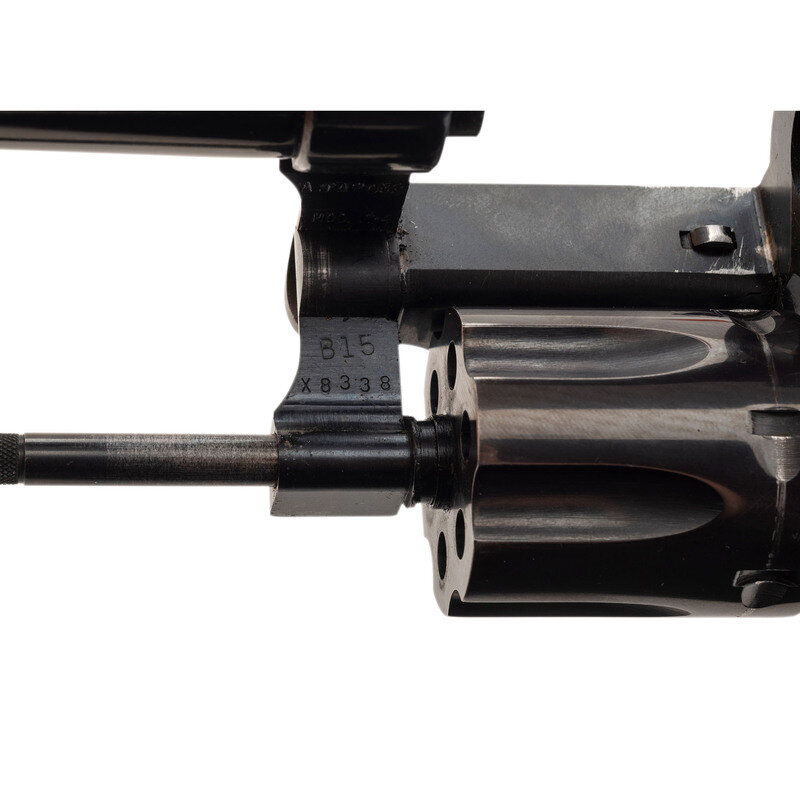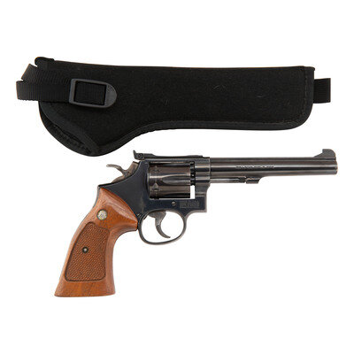 .22 LR. 5.875" barrel length. SN: ATA2082. Blued metal finish mounting color case hardened hammer and trigger and checkered Smith & Wesson medallion Goncalo Alves grips. Double-action six shot hand ejector revolver featuring a recessed cylinder on a three screw frame. Sights consist of adjustable white outline rear target, and a Patridge front blade on a matted barrel rib. Revolver features a wide target hammer and trigger, and exhibits standard make and model markings. The rear face of the front blade has been painted white. Comes in a black nylon UNCLE MIKE'S SIDEKICK holster.