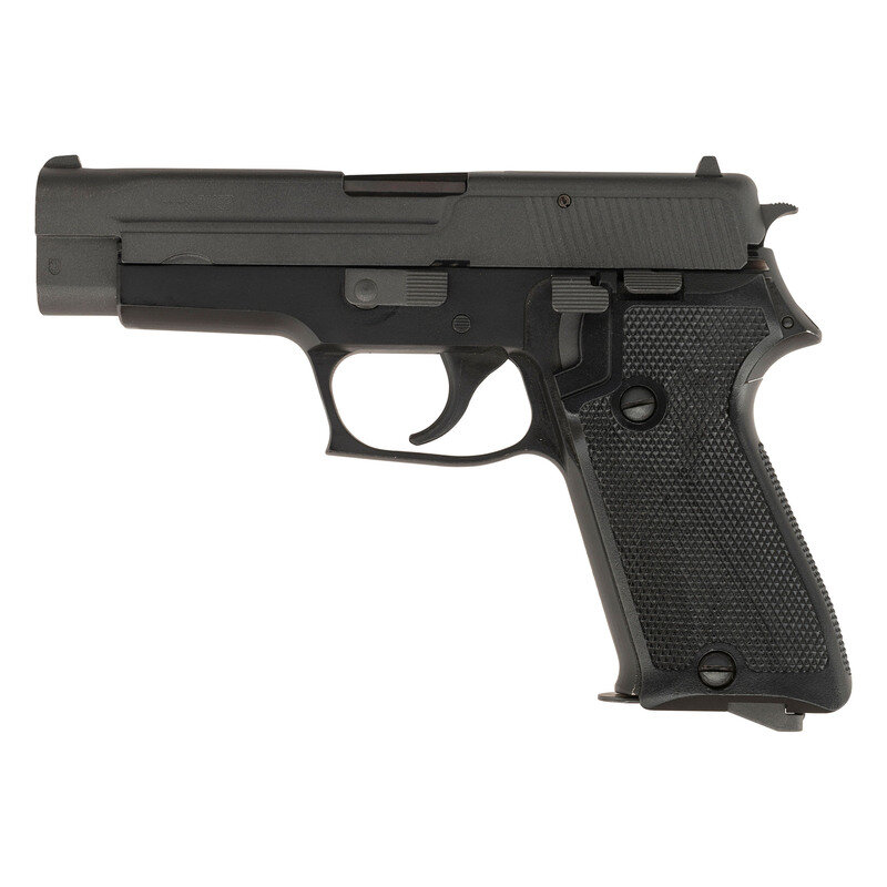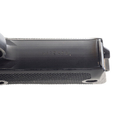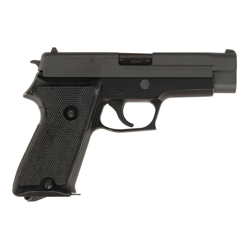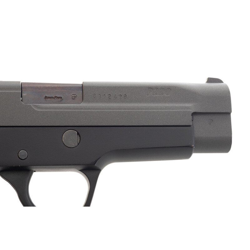 9mm Para. 4.4" barrel length. SN: G112429. Parkerized metal finish with black anodized alloy frame and polished upper surface to the breech face mounting checkered black synthetic grips. . Short recoil operated DA/SA autoloading pistol fed by detachable single-stack magazines retained by a heel-type magazine release. The right slide and barrel are struck with a combined BP proof for the Swiss Waffenfabrik Bern arms maker. The left slide and barrel are both struck SIGSAUER with the right slide marked P220. Serial numbers match on the slide, barrel, and frame. Comes with one magazine.
