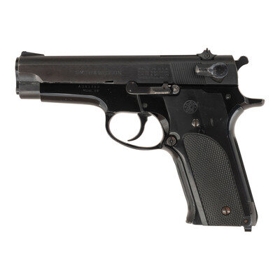 9mm Para. 4" barrel length. SN: A361380. Blued metal finish with black anodized frame and checkered black synthetic Smith & Wesson monogram grips. Short recoil operated DA/SA autoloading pistol fed by detachable double stack magazines and mounting an aluminum alloy frame. Sights consist of an adjustable rear notch and matted front ramp. Standard make and model markings including MODEL 59 to the left frame, and the four line address to the left slide. Comes with one magazine.