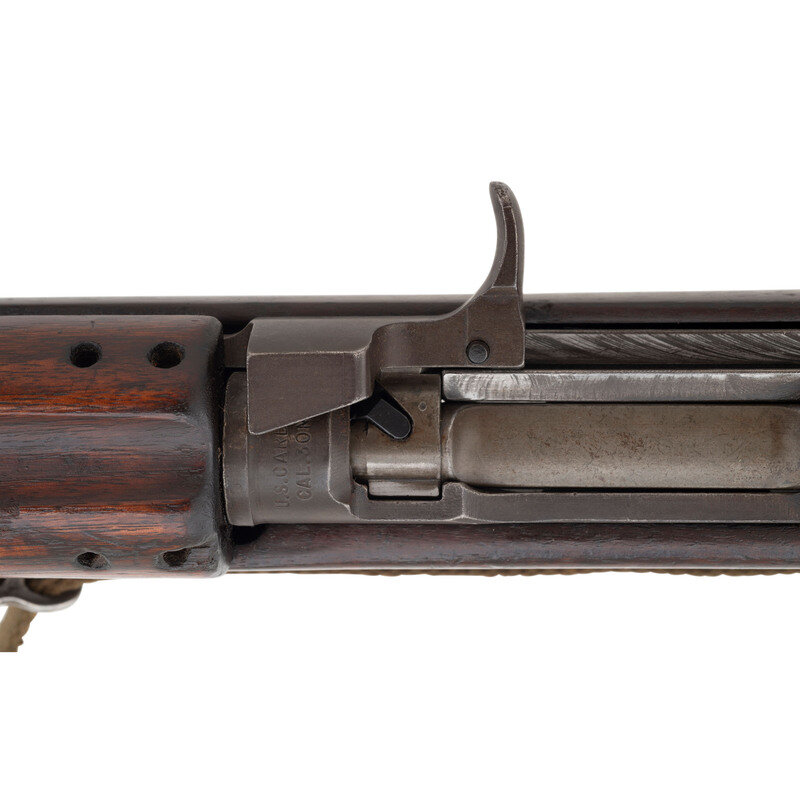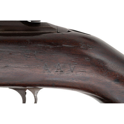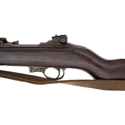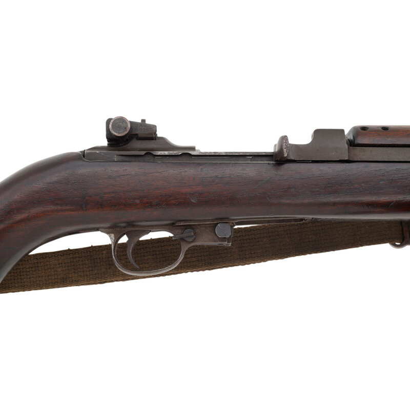 .30 carbine. 18" barrel length. SN: 3873369. Parkerized metal finish. Walnut stock has a plain semi pistol grip and forearm, with four rivet handguard, low wood, and oval cutaway. Semi automatic rifle with type III stamped rear sight and blade front sight with ear protectors. Item features a type III bayonet lug forend, flat top bolt, rotary safety, and an M/WA marked push release. Markings include I.B.M CORP./3873369 to rear of receiver, U.S. RIFLE/CAL.30 M1 to front of receiver, and I.B.M. CORP. to top of barrel. Stock is marked with an AAV Augusta Arsenal rebuild marks on left side, grip is marked with a P, and bottom of grip is painted with the number 28. Includes OD sling and stock oiler.