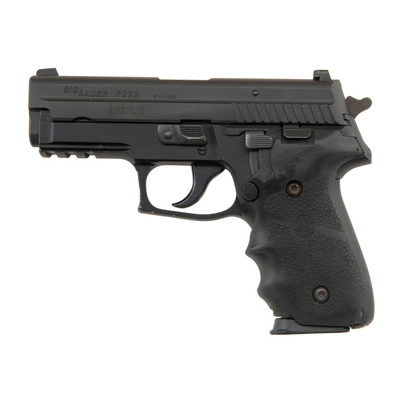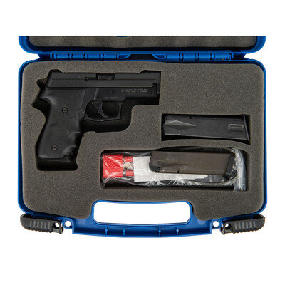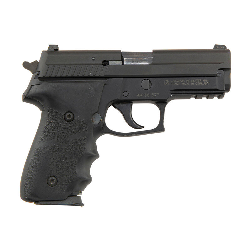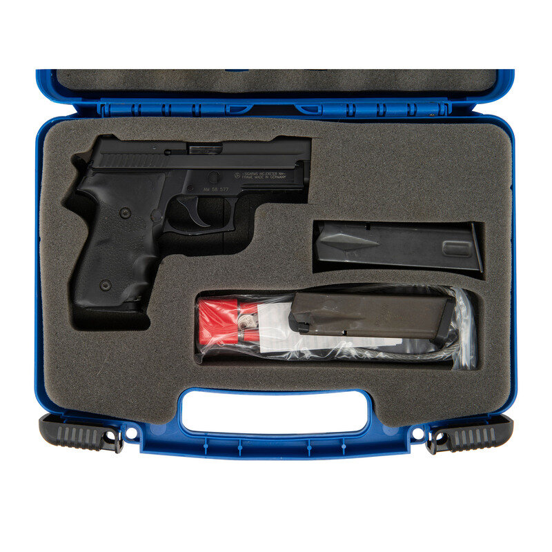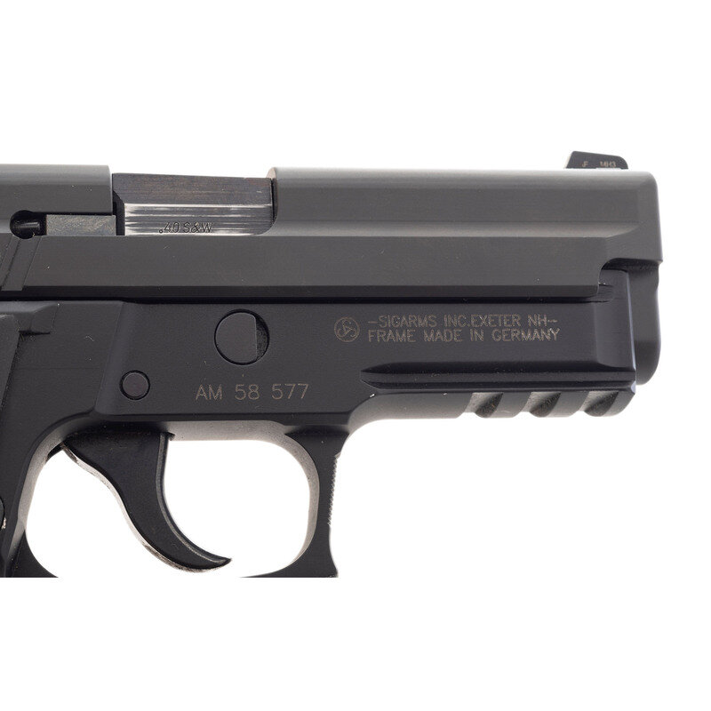 .40 S&W. 3.8" barrel length. SN: AM58577. Parkerized metal finish with black anodized frame mounting black rubber HOGUE/GRIPS and tritium triple dot night sights. Short recoil operated DA/SA autoloading pistol fed by detachable double stack magazines and featuring a frame accessory rail. Standard make and model markings overall including -SIGARMS INC. EXETER NH-/FRAME MADE IN GERMANY to the right frame. Comes in a blue synthetic hard case with two matching magazines, one 9mm Sig P226 magazine, and a cable lock in package.