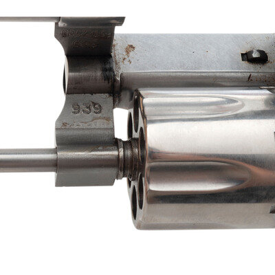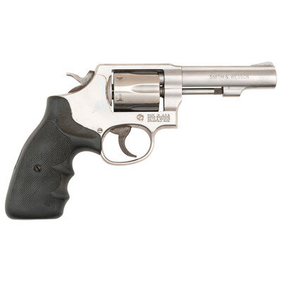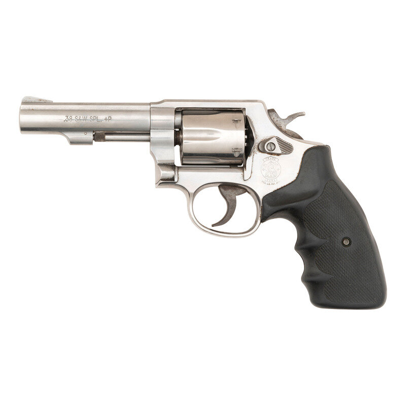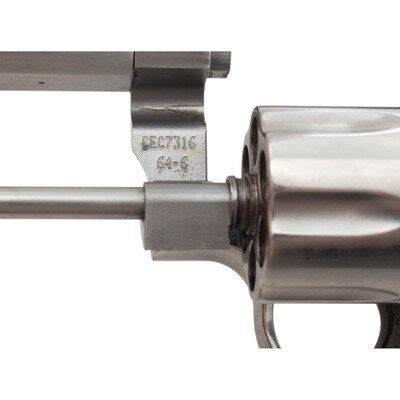 .38 Special. 4" barrel length. SN: CEC7316. Brushed stainless steel finish with color case hardened hammer and trigger mounting two-piece black rubber grips. Double action hand-ejector six shot revolver mounting topstrap notch and matted front ramp sights. Revolver shows the caliber marking .38 S&W SPL. +P on the left barre, and the monogram trade mark to the left frame. Standard four-line address is struck into the right frame.