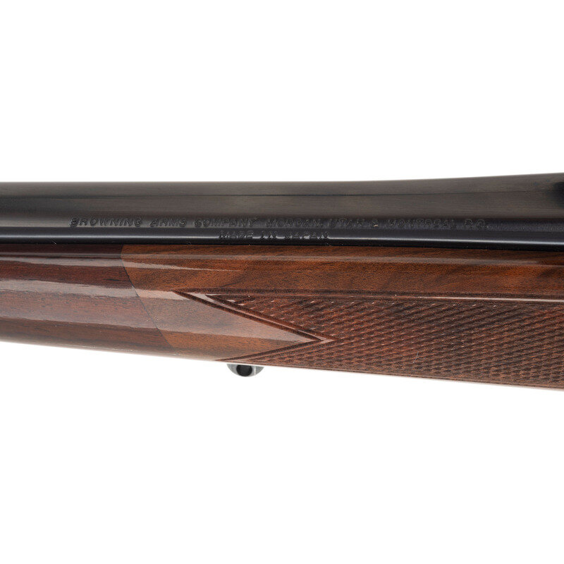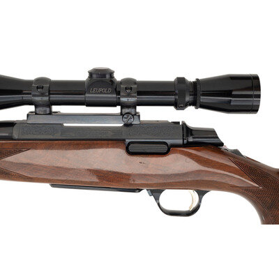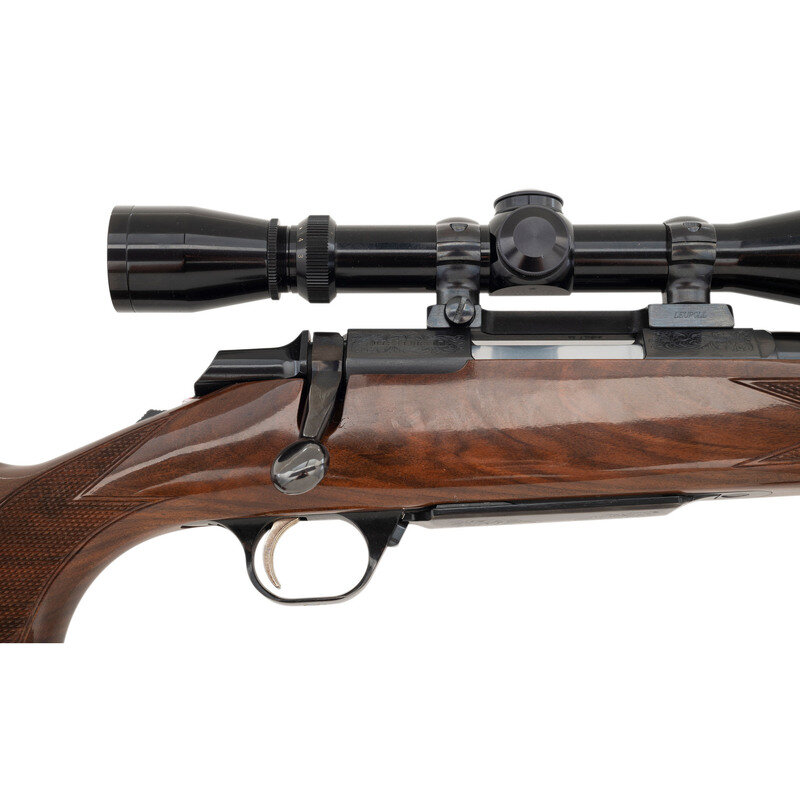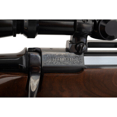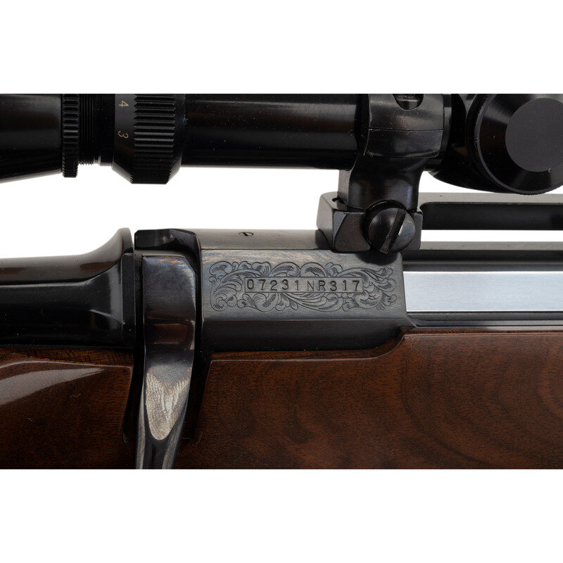 .243 Winchester. 22" barrel length. SN: 07231NR317. Blued metal finish. Walnut stock has checkering to semi pistol grip and forearm, with rosewood caps to grip and forend. Bolt action rifle with a Leupold Vari-X IIc 3-9x42mm scope, internal magazine, double sling studs, and a rubber recoil pad. Receiver has scrollwork and cross hatched engravings.