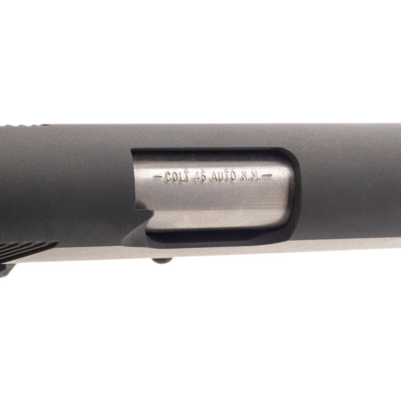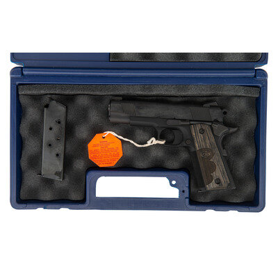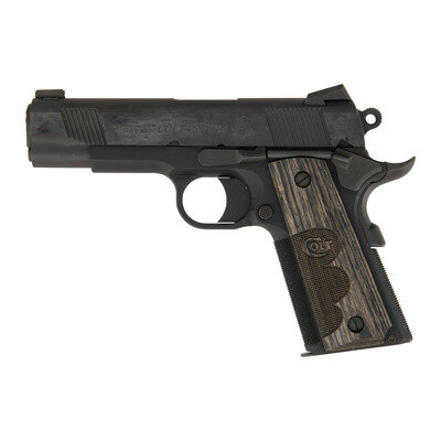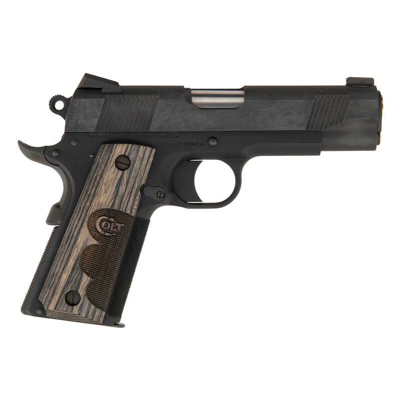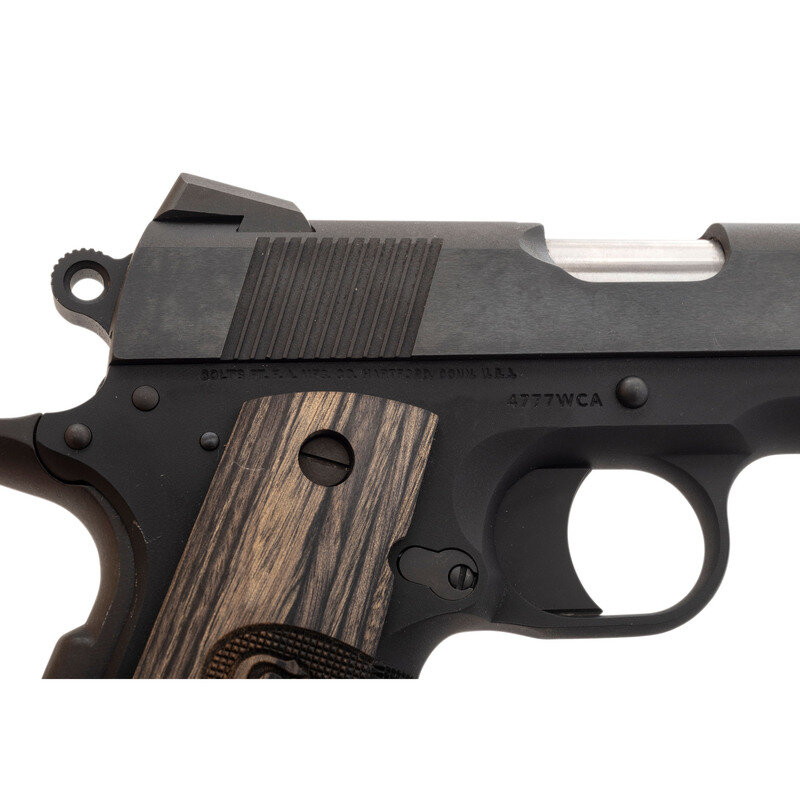 .45 ACP. 4.25" barrel length. SN: 4777WCA. Matte blued metal finish with brushed blued slide flats and mounting COLT logo fingerprint checkered laminated wood grips. Short recoil operated single action autoloading pistol fed by detachable single stack magazines and mounting NOVAK brass bead front and extra-wide rear sights. Features include: front and rear cocking serrations, high cut frame, beveled magazine well, knurling to front gripstrap and to flat mainspring housing, and mounting extended beavertail grip safety. Left slide is marked COMMANDER/MODEL COLT AUTOMATIC/CALIBER .45 followed by {Rampant Colt} logo forward of the cocking serrations. Right frame displays the single line Colt address marking. Comes in a COLT marked blue synthetic hard case with two magazines, owner's manual,