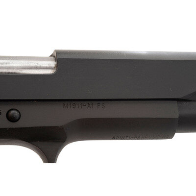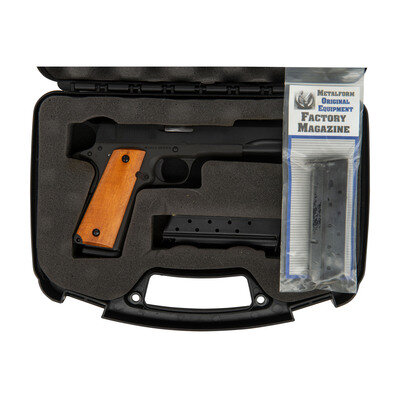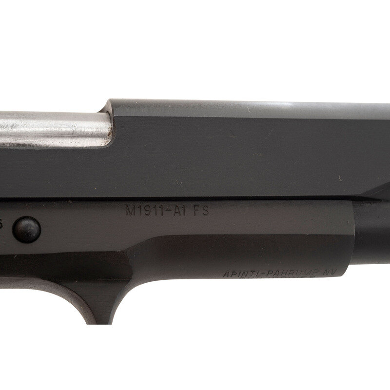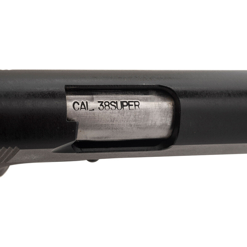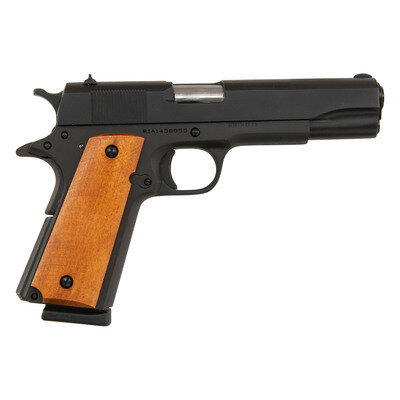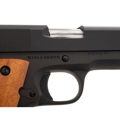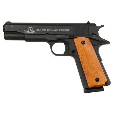 .38 Super. 5" barrel length. SN: RIA1438855. Parkerized metal finish overall with brushed stainless breech and mounting polished smooth wood grips. Short recoil operated single action autoloading pistol fed by detachable single stack magazines and displaying standard make and model markings overall. Features include standard military pattern sights with features typical of the M1911A1 pattern pistol with flat mainspring housing. Left slide is marked ROCK ISLAND ARMORY beside company logo. Underside of the frame is struck APINTL-PAHRUMP NV/PHILIPPINES with left frame displaying the model marking M1911-A1 FS on the right frame. Comes in a matching black synthetic case with factory test casing in package, owner's manual, three magazines, warranty card, and ARMSCOR/USA advertisement disc in sealed package.