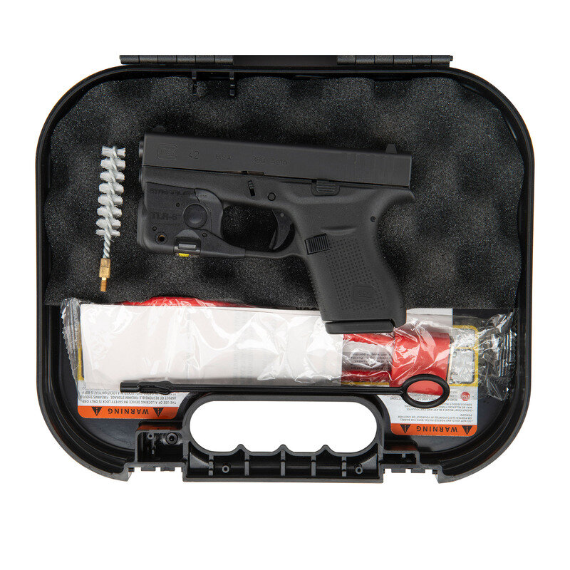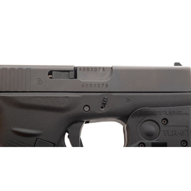 .380 ACP. 3.25" barrel length. SN: ABBX078. Black Nitron finish set in a black synthetic frame with attached STREAMLIGHT TLR-6 combination weapon light and laser. Short recoil operated striker-action autoloading pistol fed by detachable double stack magazines. Item shows standard make and model markings indicating manufacture by Glock USA. Item comes in a matching cardboard box with one magazine, a synthetic cleaning rod, nylon bore brush, cable lock in package, and the owner's manual with inserts.