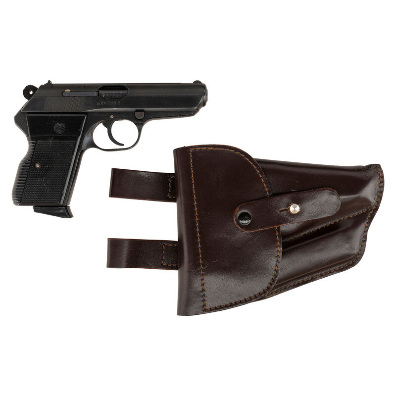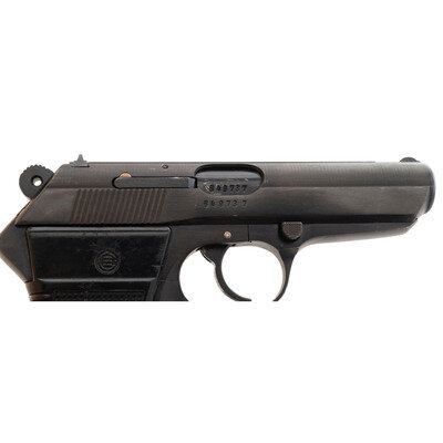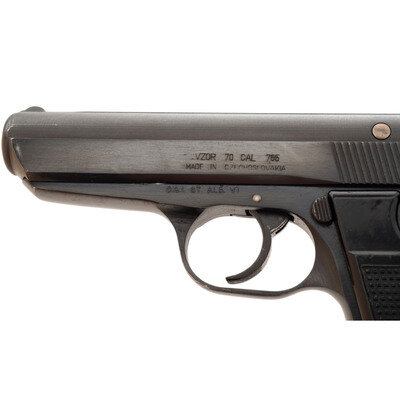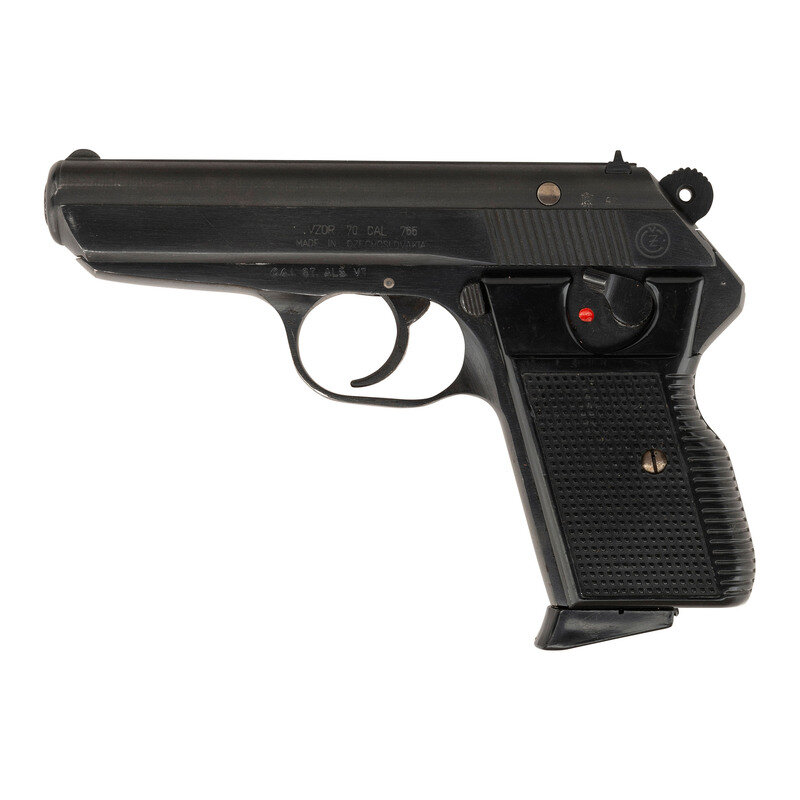 .32 ACP. 3.78" barrel length. SN: 649737. Blued metal finish overall mounting two piece black synthetic grips with stippled texturing and standard low-profile sights on a matted rib. DA/SA simple blowback operated autoloading pistol fed by detachable single stack magazines and featuring a frame-mounted safety/de-cocker. Left slide is marked VZOR 70 CAL 7,65/MADE IN CZECHOSLOVAKIA with the left frame displaying the importer marking C.A.I. ST. ALB. VT. {Czech Eagle} stamps appear on the left frame and the left slide with the latter beside a date code of 80. Item comes with two magazines and a leather flap holster showing a K676 stamp to the flap.