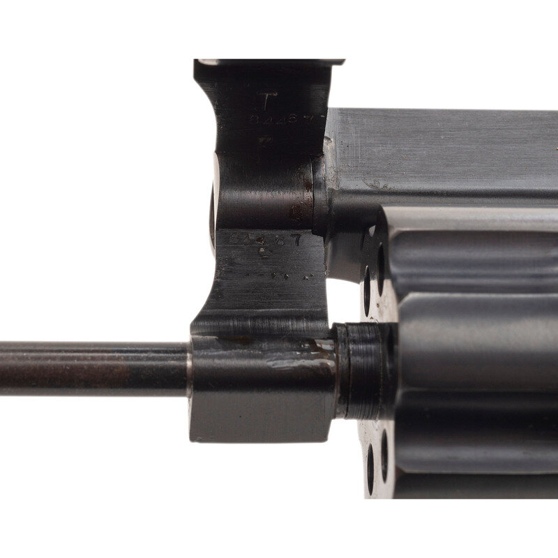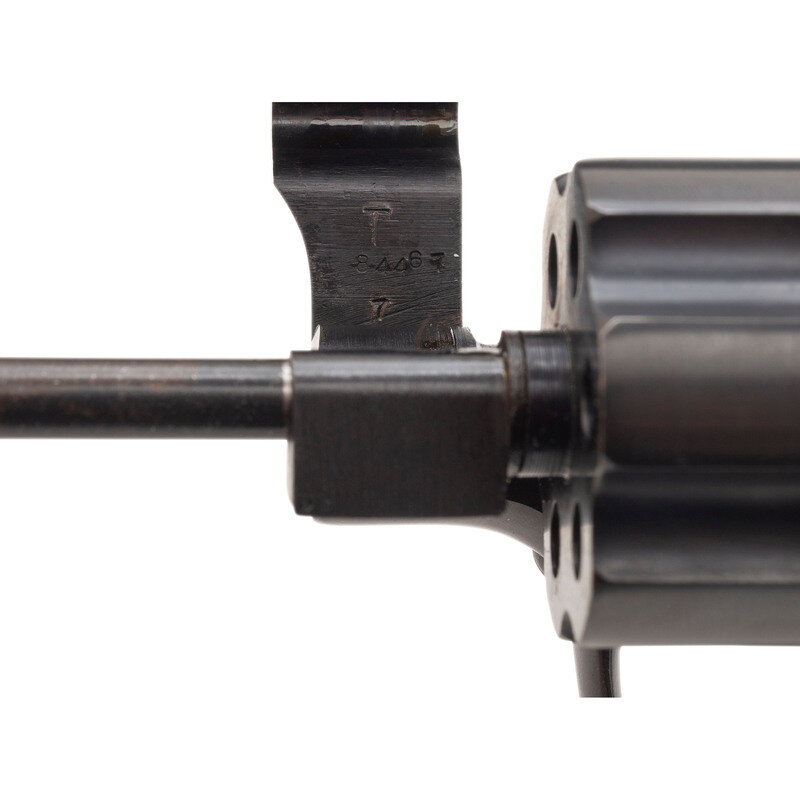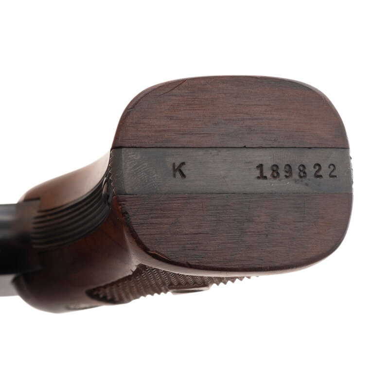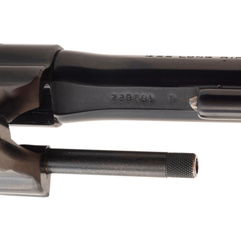 .22 LR. 6" barrel length. SN: K189822. Blued metal finish overall with color case hardened hammer and trigger mounting Smith & Wesson medallion Walnut grips. Double action six-shot hand ejector revolver featuring a pinned barrel, recessed cylinder, on a five-screw frame. Sights consist of an adjustable target rear notch and pinned Patridge front blade atop a matted barrel rib. Standard markings include monogram trade mark to the sideplate and four-line address to the right frame. Serial numbers match on the butt, barrel, right grip panel and cylinder.