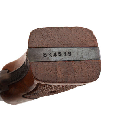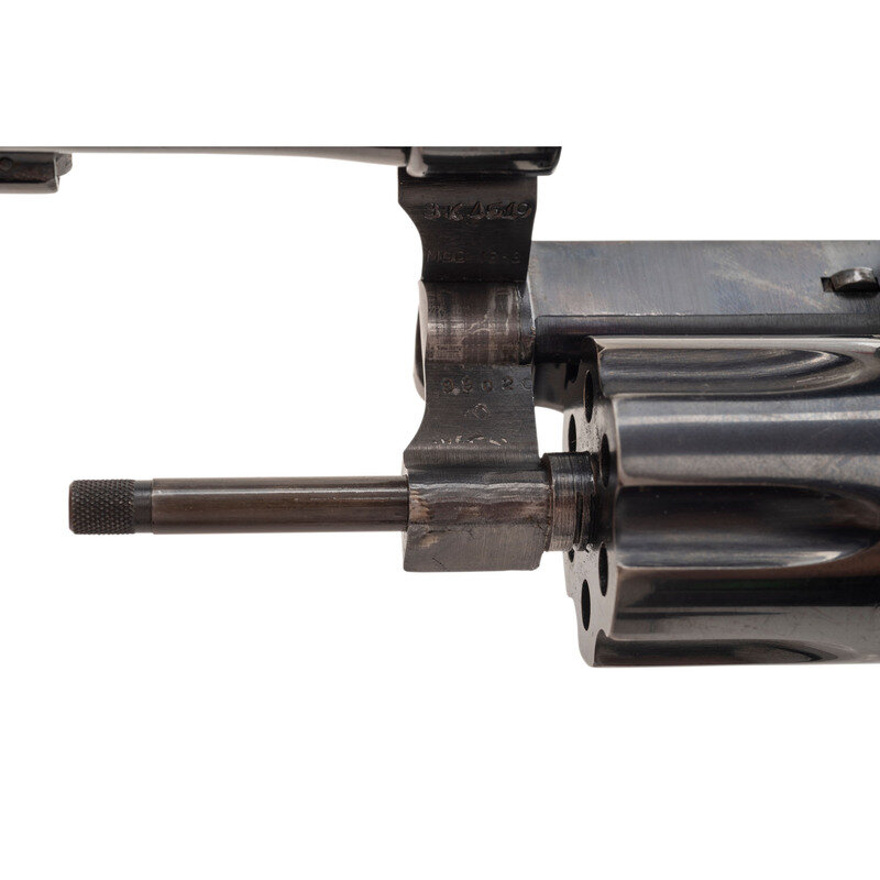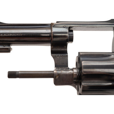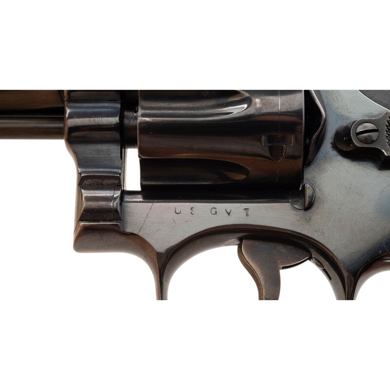 .22 LR. 4" barrel length. SN: 8K4509. Blued metal finish with color case hardened hammer and trigger mounting boxed checkered Smith & Wesson medallion walnut grips. Double action hand ejector six-shot revolver featuring a pinned barrel and recessed cylinder on a three screw frame. Sights consist of an adjustable rear notch and Baughman Quick Draw pattern matted front ramp sights atop a matted barrel rib. Item has been struck US GVT on the left frame, and exhibits standard markings elsewhere, including SMITH & WESSON on the left barrel, four-line address to the right frame, and monogram trademark to the sideplate.