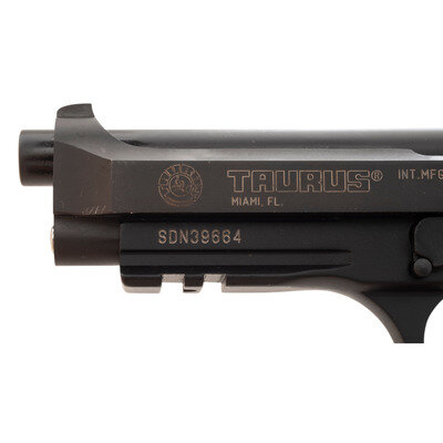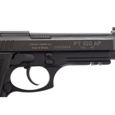 .40 S&W. 5" barrel length. SN: SDN39664. Matte blued metal finish with black anodized frame mounting black synthetic TAURUS logo grips and triple white dot sights. Short recoil operated DA/SA autoloading pistol fed by detachable single stack magazines. Item features ambidextrous frame mounted thumb safety switch and a frame mounted accessory rail. Standard markings include import mark reading TAURUS INT. MFG. INC./MIAMI, FL. with right side marked FORJAS TAURUS S.A./MADE IN BRAZIL followed by model and caliber markings PT 100 AF/CAL .40. Item comes in a matching black cardboard box with the owner's manual and two magazines.