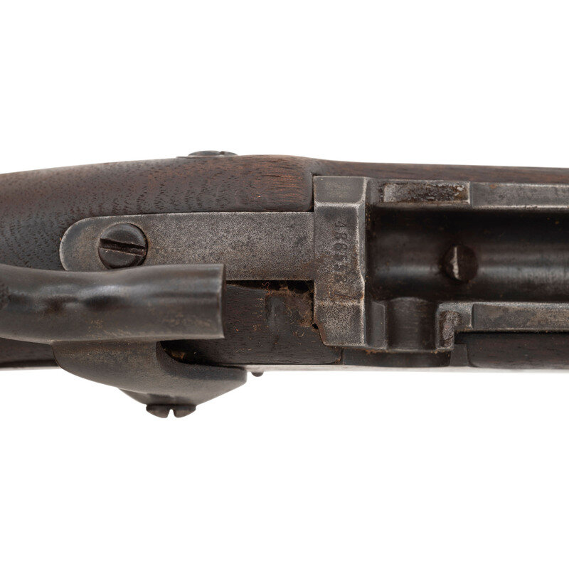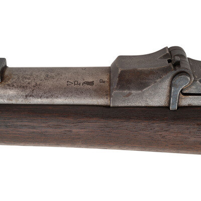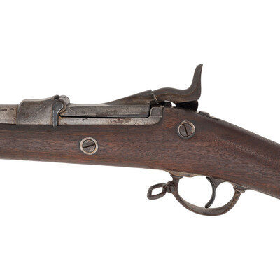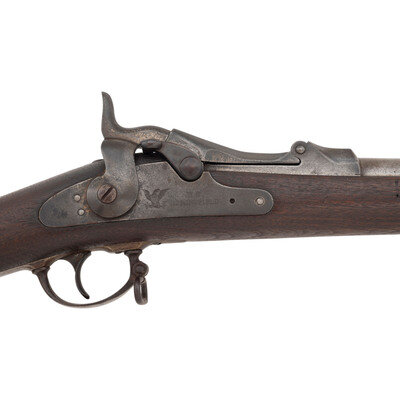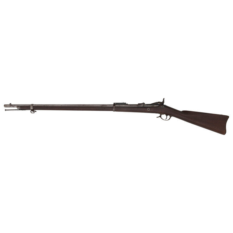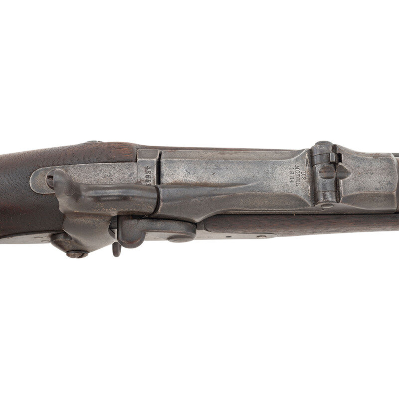 45-70. 32.625" barrel. SN: 436553 (mfg. ca1890). Blued and color casehardened finish, walnut stock. Single shot breechloading metallic cartridge military rifle with 1884 pattern Buffington adjustable ladder rear sight, fixed front sight blade on socket bayonet lug base, and sling and stacking swivels. Lock marked U.S./SPRINGFIELD with a {Spread Winged Eagle} and breechblock marked U.S./MODEL/1884. No cartouche or firing proof are present in the wood. Breech with V/P/{Eagle Head} inspection marks as well as additional small P and A marks. Rifle features a low arch breech with steel firing pin, three-click tumbler, smooth trigger, two-piece triggerguard and solid buttplate without trap door. The rifle includes a correct pattern cleaning rod.