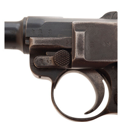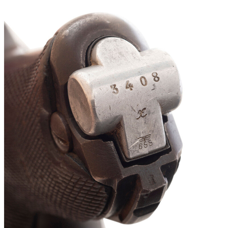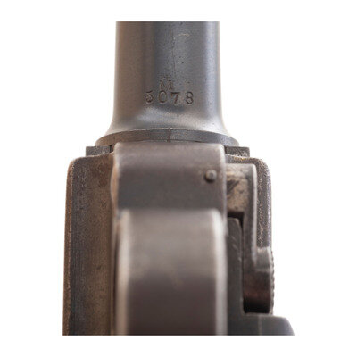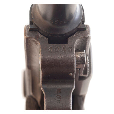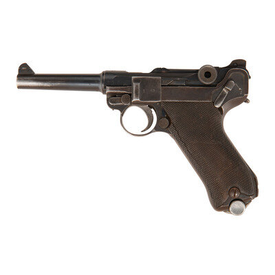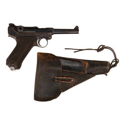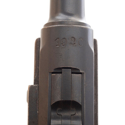 9mm Para. 3.9" barrel length. SN: 1043l. Blued metal refinish with niter blued and straw colored small parts mounting checkered walnut grip panels. Short-recoil operated toggle locking striker action pistol fed by detachable single stack magazines. Toggle link shows the DWM logo of Deutsche Waffen und Munitionsfabriken, primary manufacturer of the Luger Pistol through World War I. Barrel extension has been struck with the date 1920, suggesting it was one of those completed after the war using excess parts. Commercial {Crown} marks appear on the left barrel, left barrel extension, and left breechblock. A pair of {Crown/M} proofs appear on the left barrel extension with a further example struck above the serial number. Left frame struck with a {Crown/B} above the trigger. The barrel, barrel extension, and toggle components match one another, but they do not match the frame serial number. Frame shows the standard GESICHERT marking to the frame. Item comes with one Waffenamt marked aluminum base plug magazine, and a presstoff holster for a P.38 pistol. Latter item marked with a large P38 model marking behind the belt loops, a CXB manufacturer code of Moll Lederwarenfabrik, and no discernable Waffenamt mark.