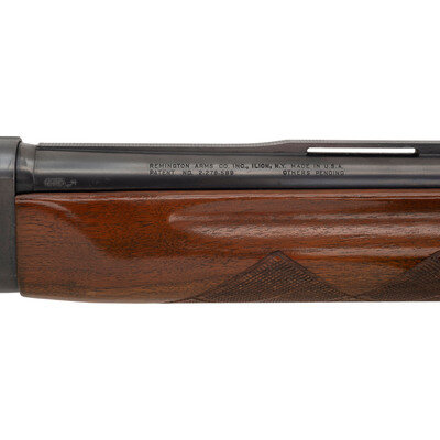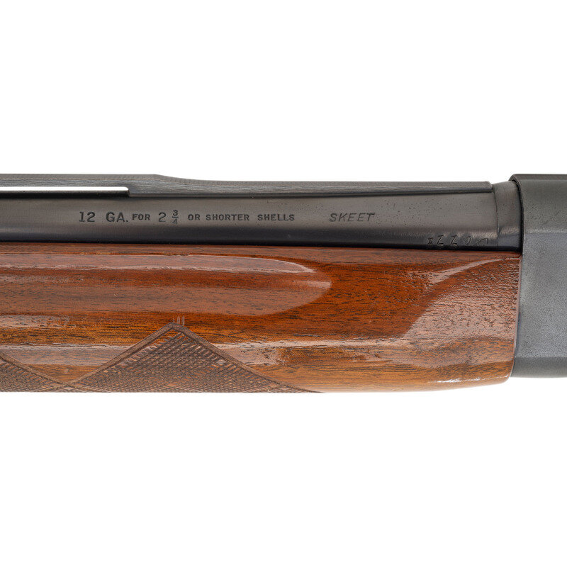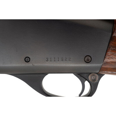 12 gauge. 25.5" barrel length. Cylinder choke. SN: 3111922. Blued metal finish. Two piece walnut stock has checkering to semi pistol grip and skip-line checkering to forearm. Semi automatic shotgun with a vented rib, steel bead mid-sight, and ivory bead front sight. Item features a tube magazine, rubber recoil pad, and a triggerguard that is engraved with a gothic-style W left in the white.