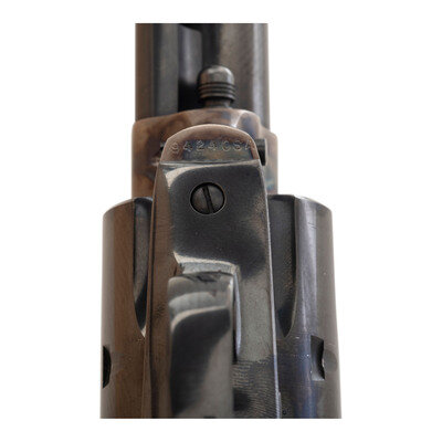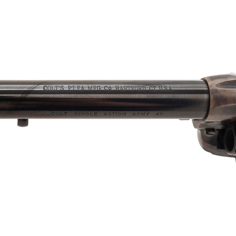 .45 Long Colt. 7.5" barrel length. SN: 94240SA. Blued metal finish with color case hardened frame and polished hammer flanks mounting checkered black synthetic Colt Eagle pattern grips. Single action six-shot hand ejector revolver featuring a topstrap notch and front blade sights along with spring loaded ejector to right barrel. Left frame is struck with two-line patent followed by {Rampant Colt} logo with the left barrel showing model marking COLT SINGLE ACTION ARMY .45. Top of the barrel is struck COLT'S PT. F.A. MFG. CO. HARTFORD CT. U.S.A.
