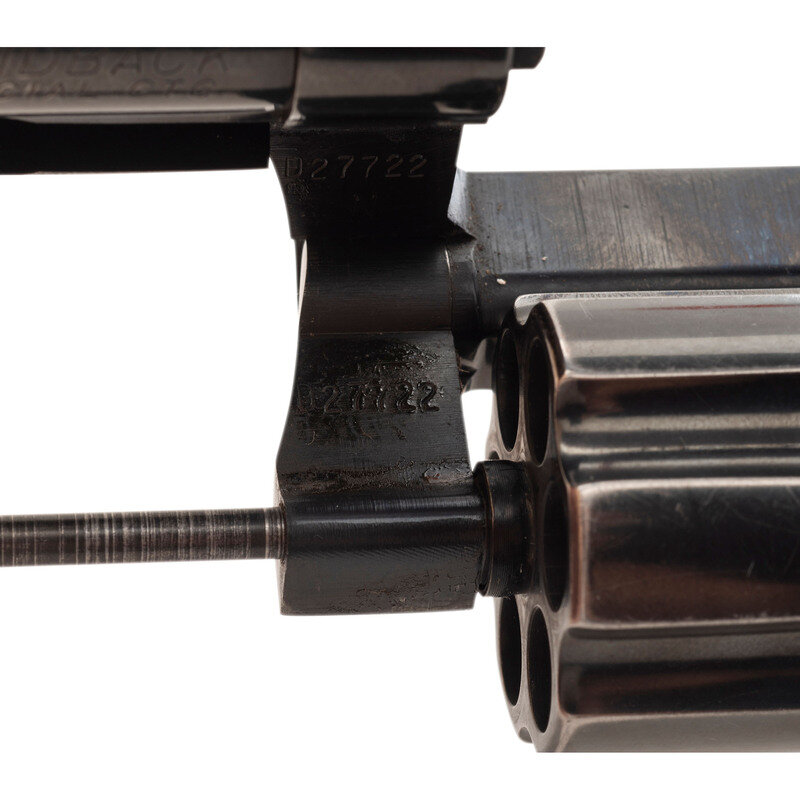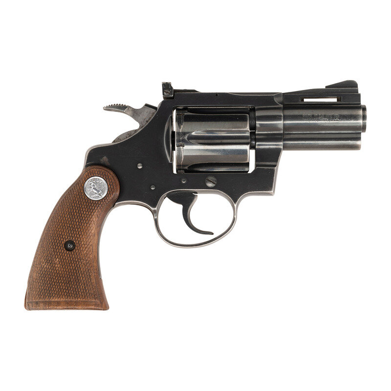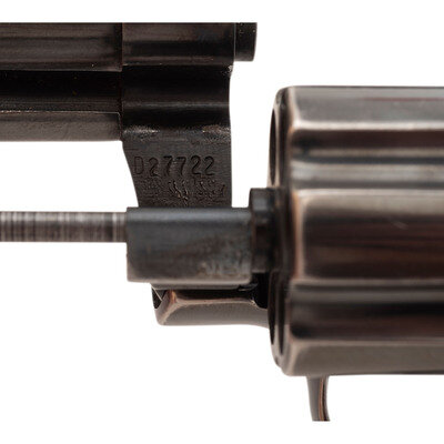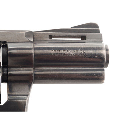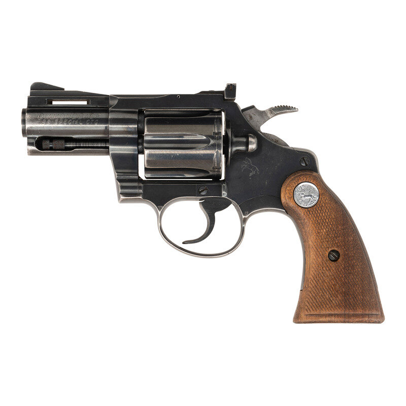 .38 Special. 2.5" barrel length. SN: D27722. Blued metal finish with polished hammer flanks, matte finish to topstrap and upper barrel, and mounting checkered walnut Colt medallion grips. Double action six-shot hand ejector revolver featuring a full length vented rib and underlug. Markings include Standard Colt VP monogram proof to the left triggerguard with model and caliber marking to left barrel reading DIAMONDBACK/.38 SPECIAL CTG. The {Rampant Colt} logo appears on the left sideplate. Right barrel displays the two-line address marking COLT'S PT. F.A. MFG. CO./HARDTFORD, CONN. U.S.A.
