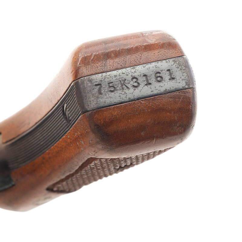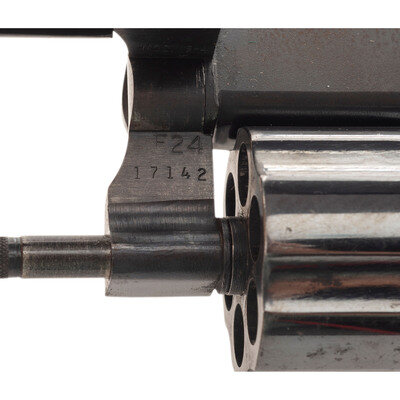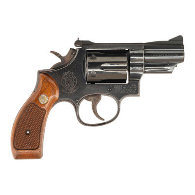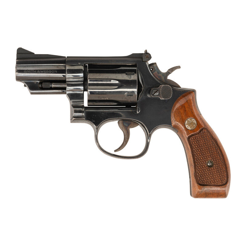 .357 Magnum. 2.5" barrel length. SN: 75K3161. Blued metal finish with color case hardened hammer and trigger mounting checkered walnut Smith & Wesson medallion grips. Double action six-shot hand ejector revolver mounting adjustable rear notch and Baughman Quick Draw front ramp sights. Item features a pinned barrel and recessed cylinder on a three-screw frame. Standard markings include Smith & Wesson monogram trade mark to the sideplate with four-line address on the right frame. Hammer flanks show standard maker and caliber marks.