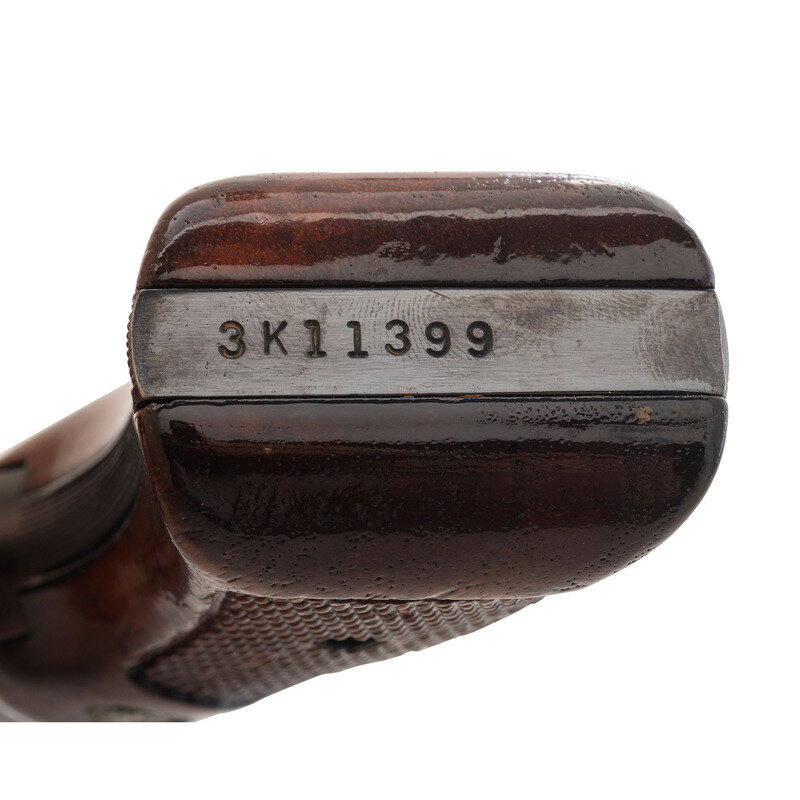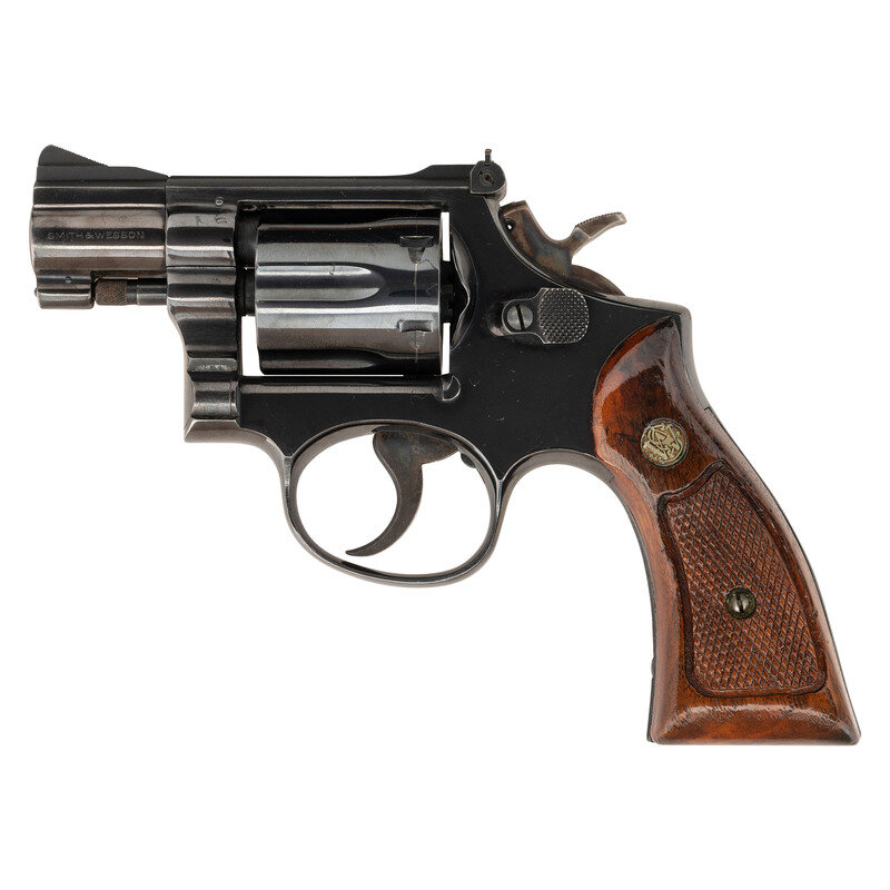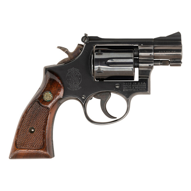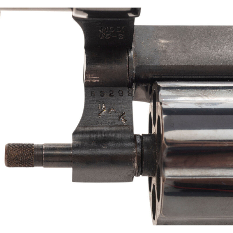 .38 Special. 2" barrel length. SN: 3K11399. Blued metal finish with color case hardened hammer and trigger mounting topstrap notch and Baughman Quick Draw front ramp sights. Double action six-shot hand ejector revolver mounting refinished Smith & Wesson medallion checkered walnut grips. Item features a pinned barrel on a three screw frame, and shows the standard Smith & Wesson monogram trade mark to the right sideplate and four-line address to the frame.