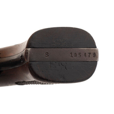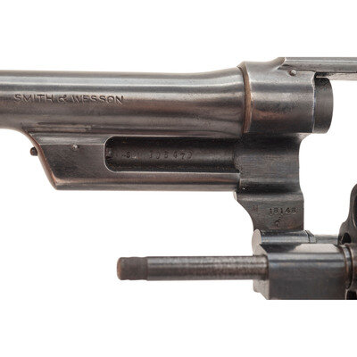 .38 Special. 5" barrel length. SN: S105479. Blued metal finish with jeweled hammer, color case hardened trigger, and mounting checkered walnut Smith & Wesson medallion grips. Double action six-shot hand ejector revolver featuring topstrap notch and half-moon front blade sights. Serial numbers match on the butt, barrel, cylinder, and star extractor. Item features a pinned barrel on a five-screw frame. Standard markings include SMITH & WESSON to left barrel and 38 S.&W. SPECIAL CTG. to the right. Right sideplate shows Smith & Wesson monogram trade mark while the right frame is struck MADE IN U.S.A./MARCAS REGISTRADAS/SMITH & WESSON/SPRINGFIELD, MASS. Jeweling on the hammer is aftermarket.