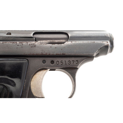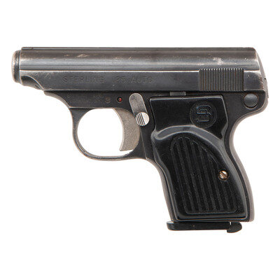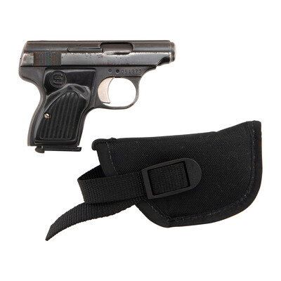 .25 ACP. 2.25" barrel. SN: 051373. Blued finish, grooved plastic Sterling logo grips. Fixed barrel blow back design detachable magazine fed semi-automatic pistol with grooved slide rear sight, front sight blade, rotating safety and heel magazine release. Includes a single magazine and a Cordura Uncle Mike's Sidekick holster.