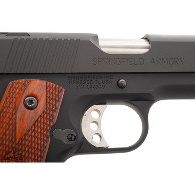 9mm. 4" bushing-less bull barrel. SN: LW144049. Blued finish, checkered Springfield Arsenal logo hardwood grips. Single action semi-automatic magazine fed tilting barrel pistol with low mount white dot rear sight, fiber optic front sight, full-length guide rod, extended beavertail grip safety with raised palm pad, flat checkered mainspring housing, extended thumb safety, adjustable light weight aluminum trigger and skeletonized commander style hammer. Includes two magazines, factory plastic box, Allen keys and a cleaning brush.
