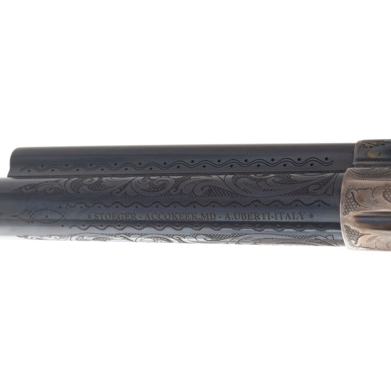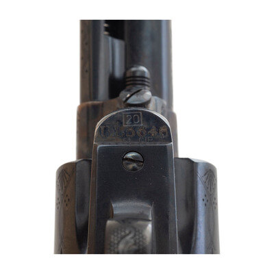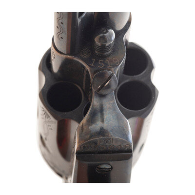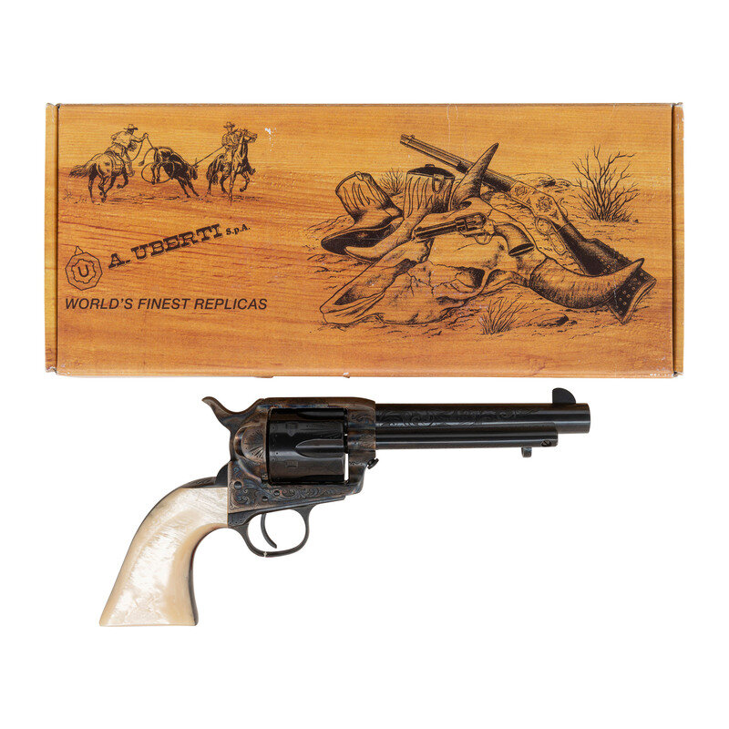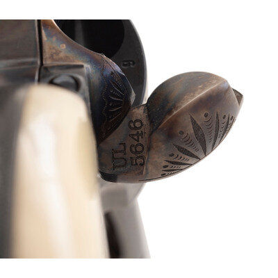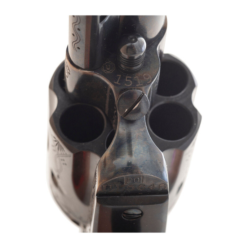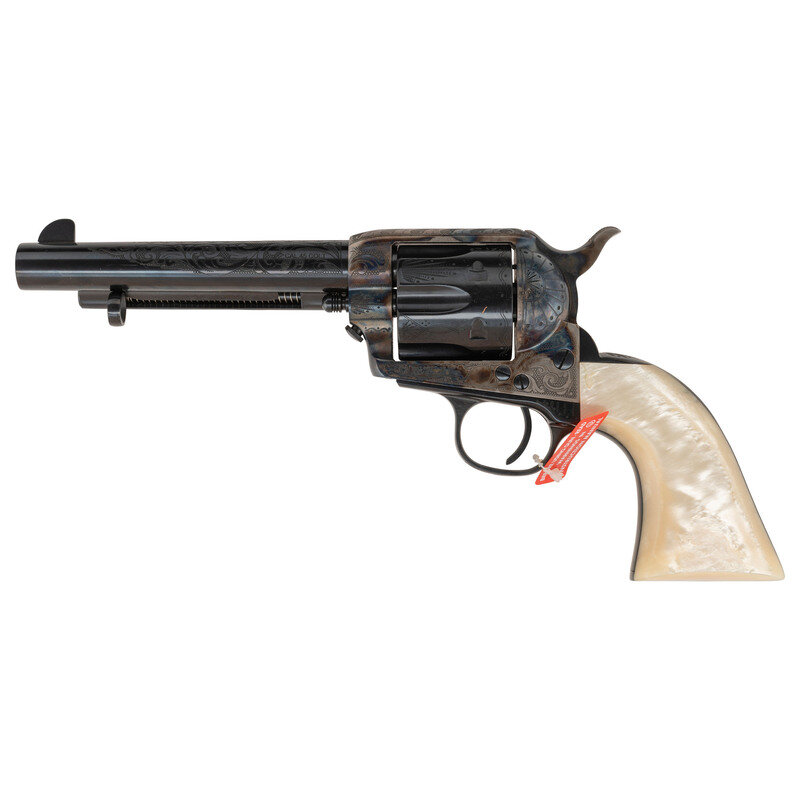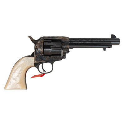 .45 Colt. 5.5" barrel. SN: UL5646. Blued and color casehardened finish, mother of pearl grips. Replica single action army revolver with "black powder" style frame, bullseye ejector rod head, fixed sights and fluted six-chambered cylinder. Revolver is engraved in a style reminiscent of Cuno Helfricht's work in the 1870s and 1880s. Revolver includes the factory cardboard box, paperwork and cable gun lock.