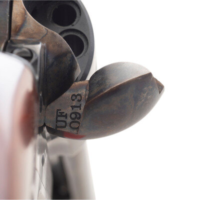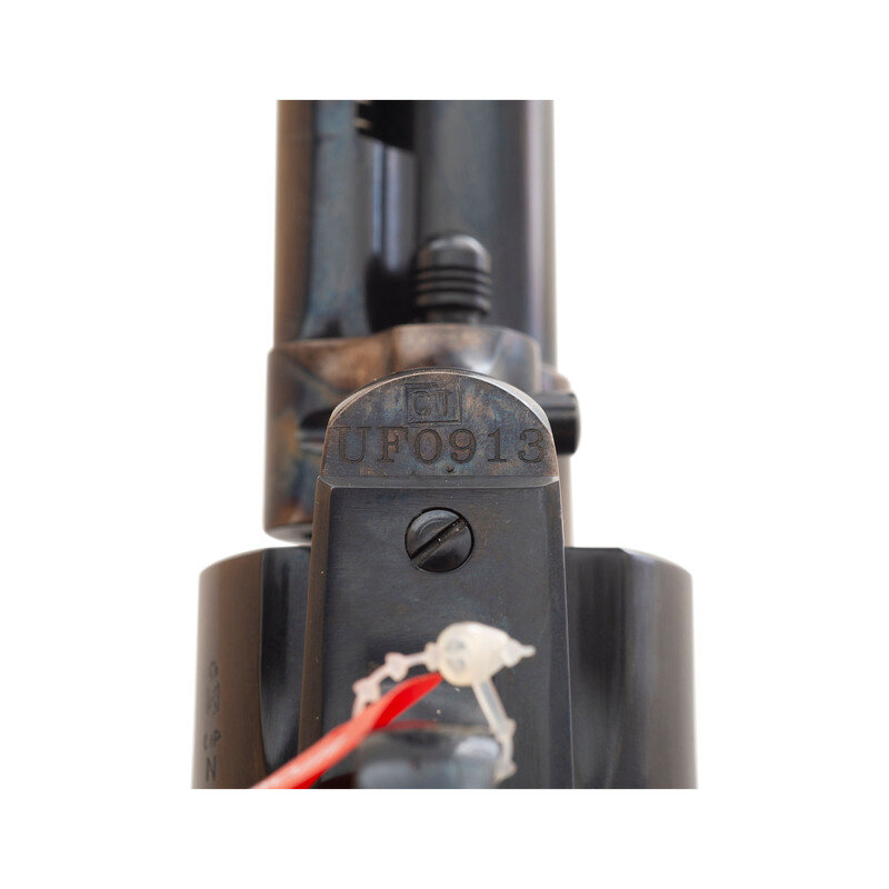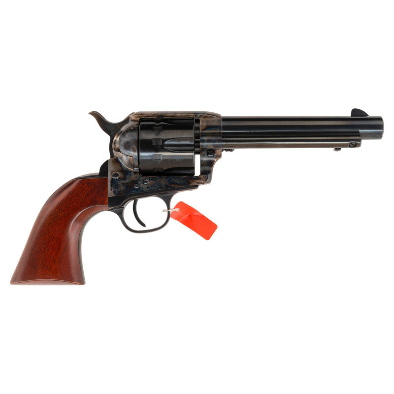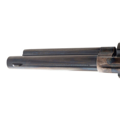 .22LR. 5.5" barrel. SN: UF0913. Blued and color casehardened finish, smooth hardwood grips. Single action "smokeless powder" frame replica single action arm revolver with loading gated, fluted 12-chambered cylinder, frame notch rear sight and blade front sight. Imported by Stoeger with factory cardboard box, cable gun lock and factory paperwork.