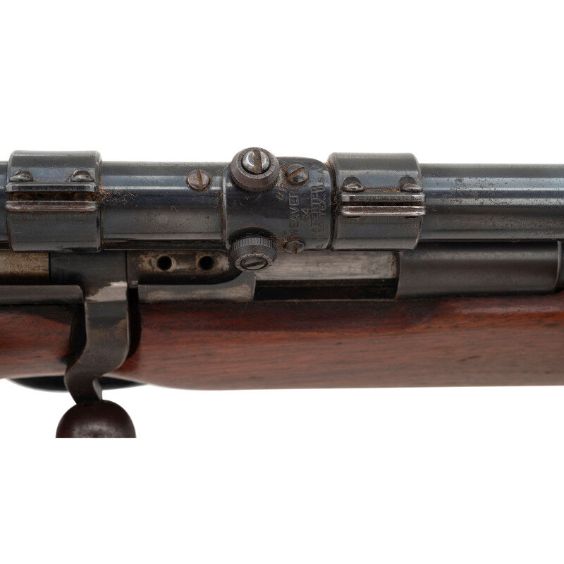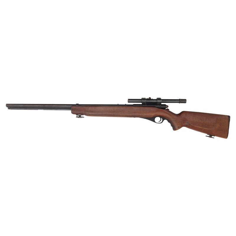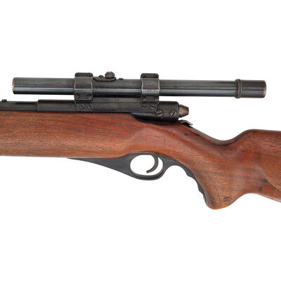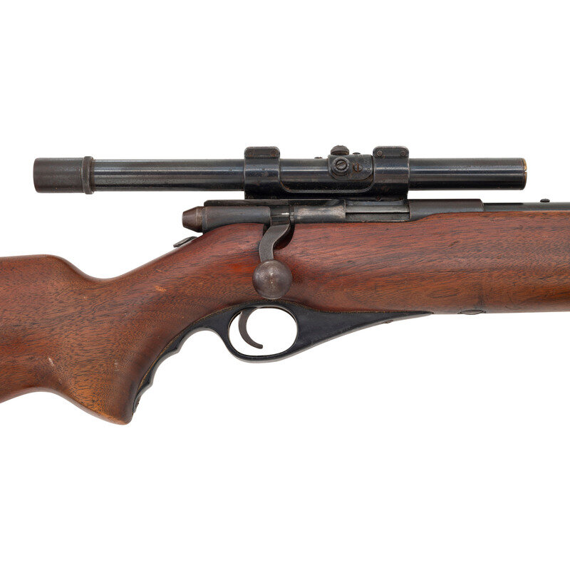 .22 S/L/LR. 26" barrel length. SN: NSN. Blued metal finish. Walnut stock with a plain semi pistol grip and forearm, with cheek rest. Bolt action rifle with a Weaver G4 scope, tube magazine, finger grooved triggerguard, and double sling swivels.