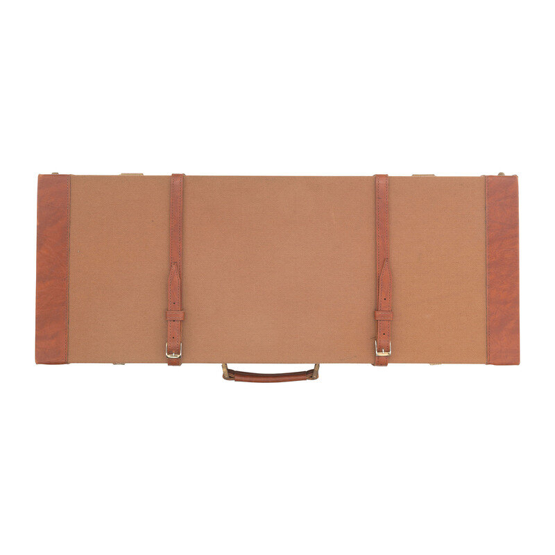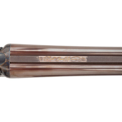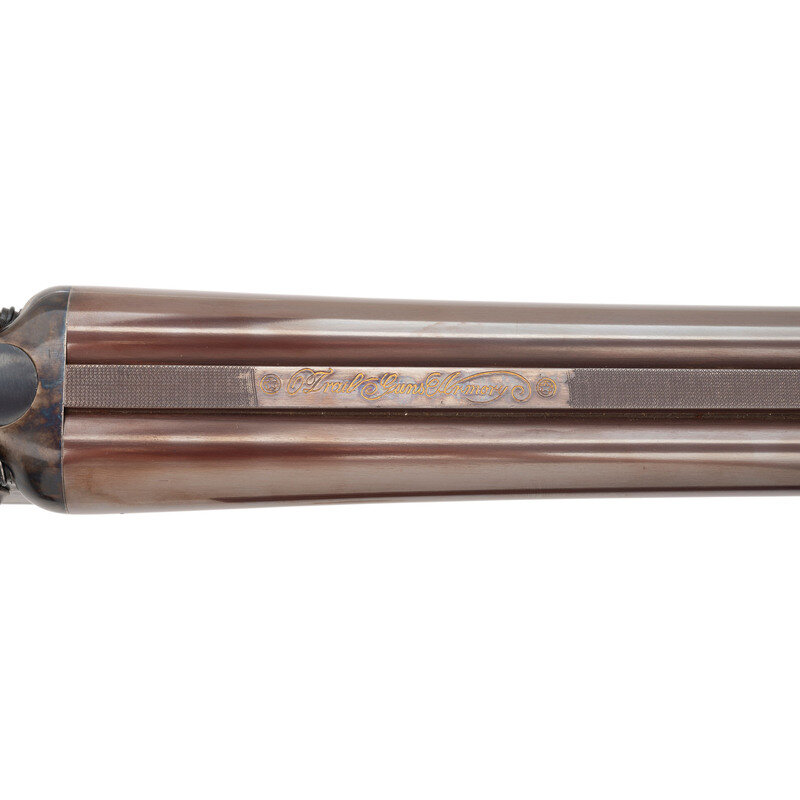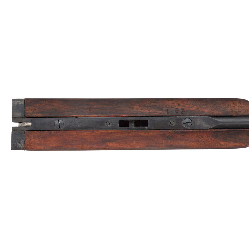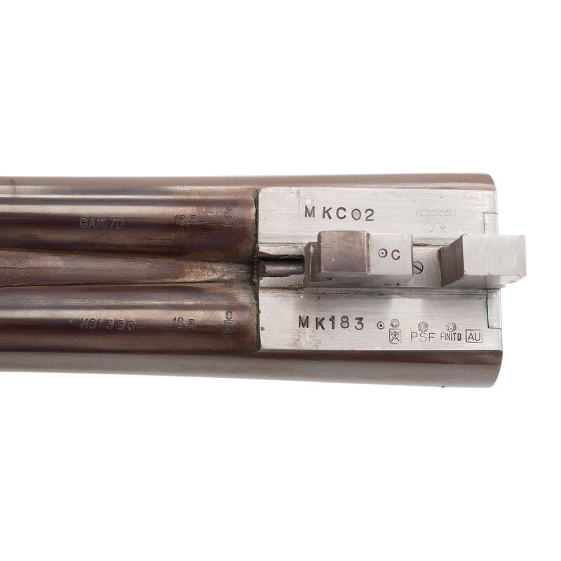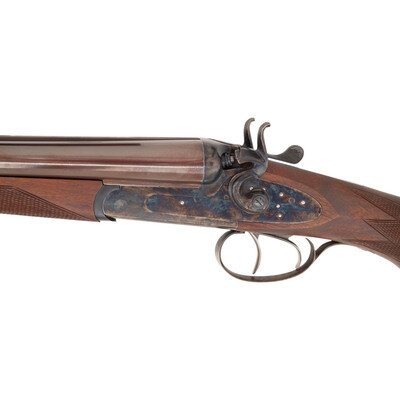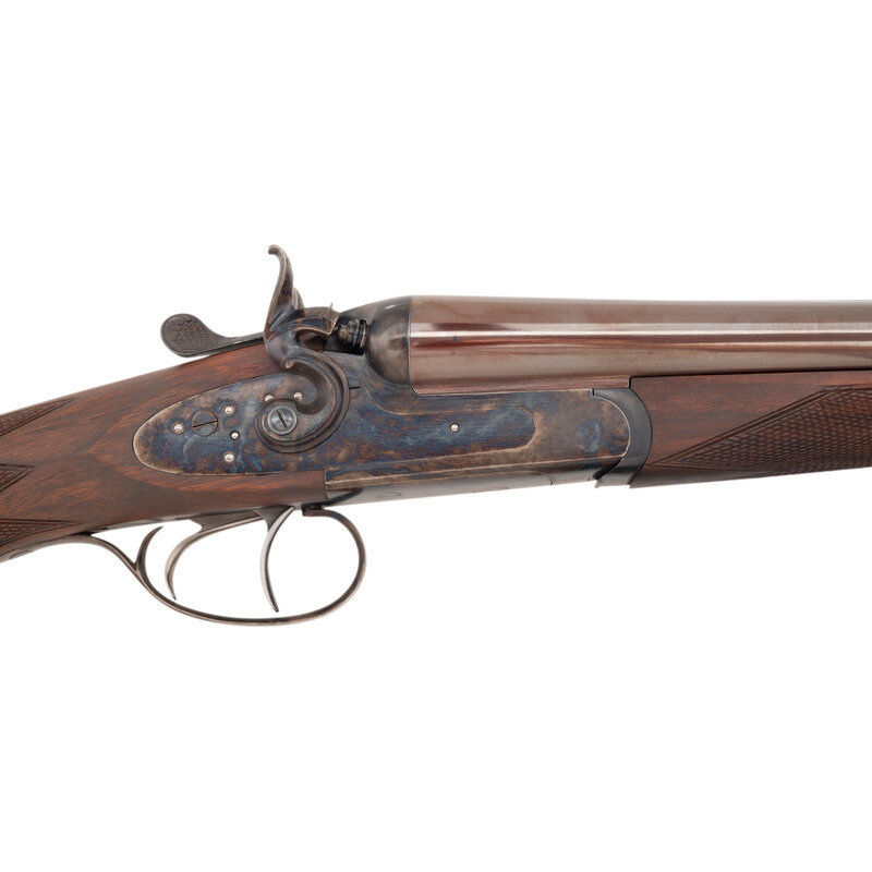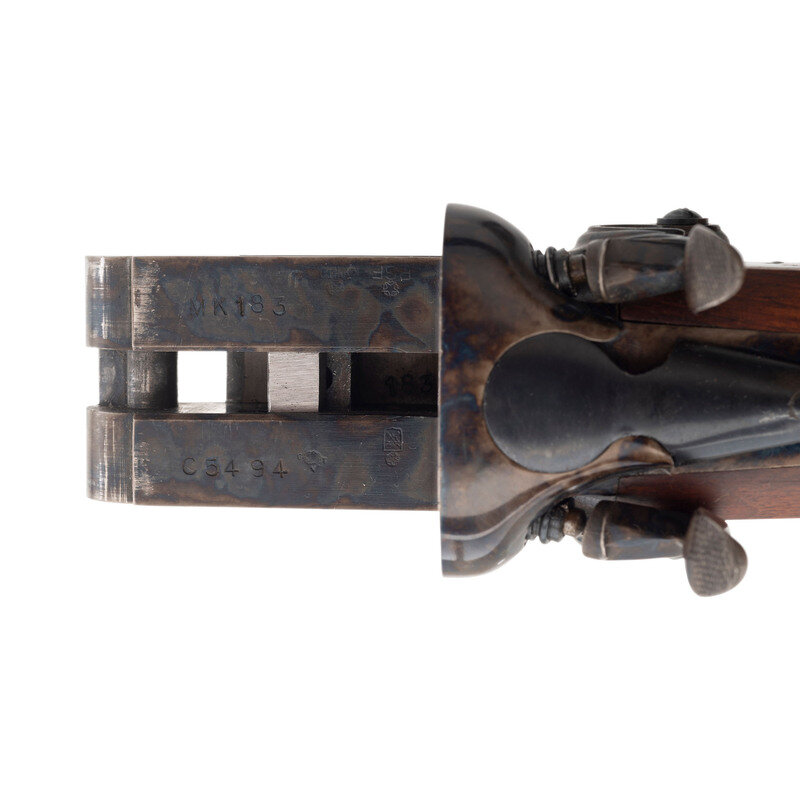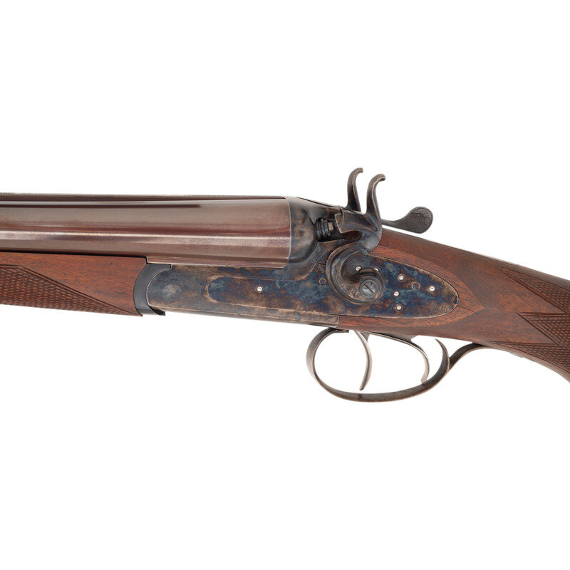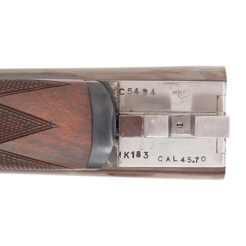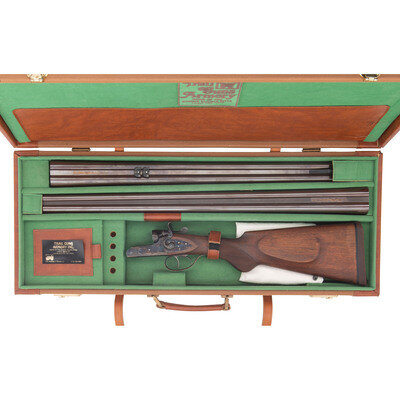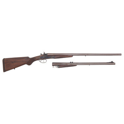 Barrel Set #1: .45-70. 24" with two adjustable flip up sight leaves and ramped front sight blade with brass bead. Barrel Set #2: 12 gauge. 27.75" with 2 3/4" chambers, choked full and modified. SN: MK183. Browned barrels, color casehardened locks, receiver and triggerguard, checkered oil finished hardwood forend, checkered pistol-gripped butt with raised cheek rest and rubber recoil. Double barreled breechloading exposed hammer double trigger modern recreation of a double rifle with a set of shotgun barrels as well. Includes a fitted leather trimmed case.
