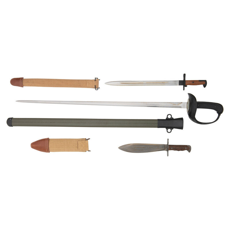 Lot of Reproduction American Edged Weapons Including: Patton Saber, 1917 Bolo, 1905 Bayonet