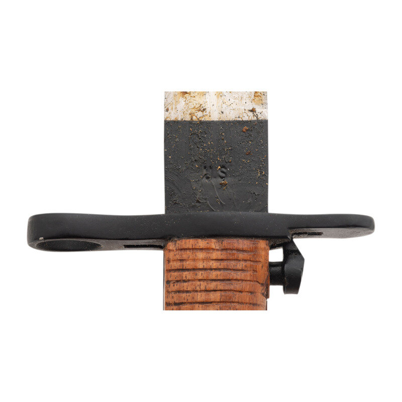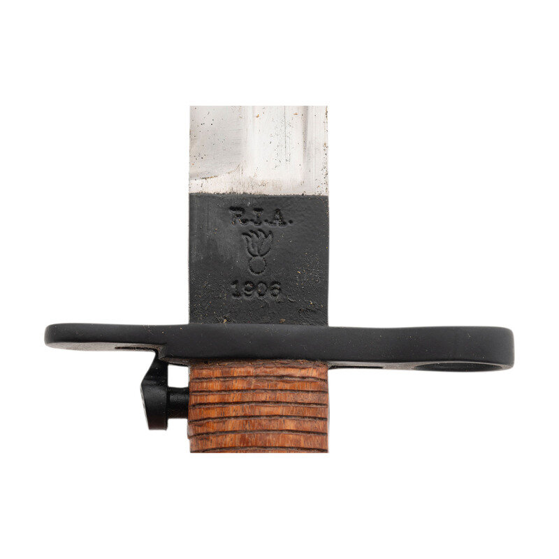 3.) 16.25" blade length. 22.75" overall with scabbard and hilt. Polished single edged fullered blade mounting a khaki canvas wrapped scabbard with stitched leather toe. Pattern of 1905 bayonet reproduction with the hilt dipped in black paint to simulate blue. Right ricasso struck US with the left marked R.I.A./{Ordnance Bomb}/1906.